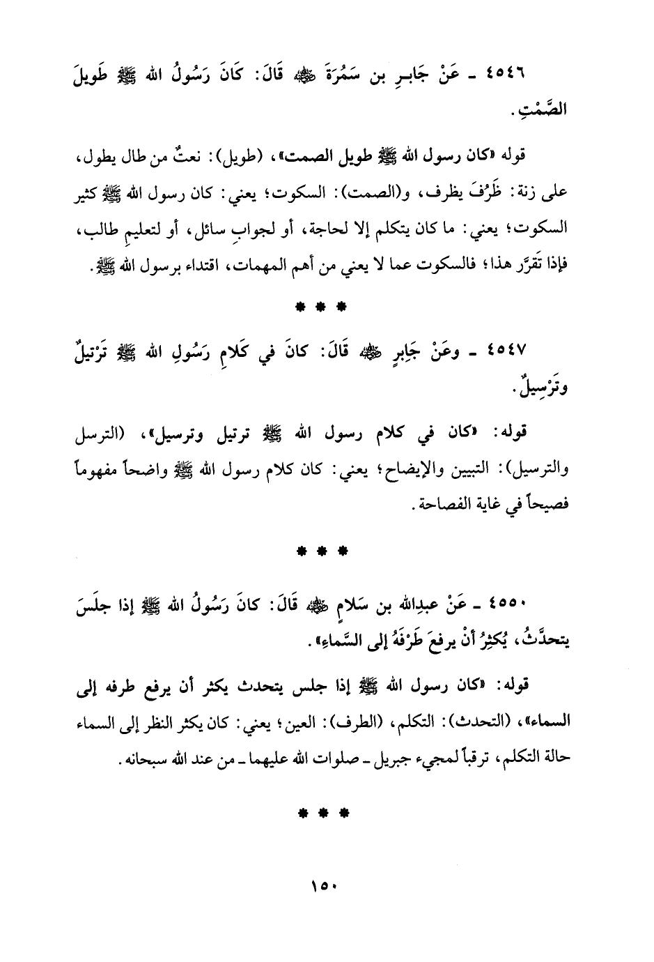 4546 - عَنْ جَابرِ بن سَمُرَةَ - رضي الله عنه - قَالَ: كَانَ رَسُولُ الله - صلى الله عليه وسلم - طَويلَ الصَّمْتِ.
