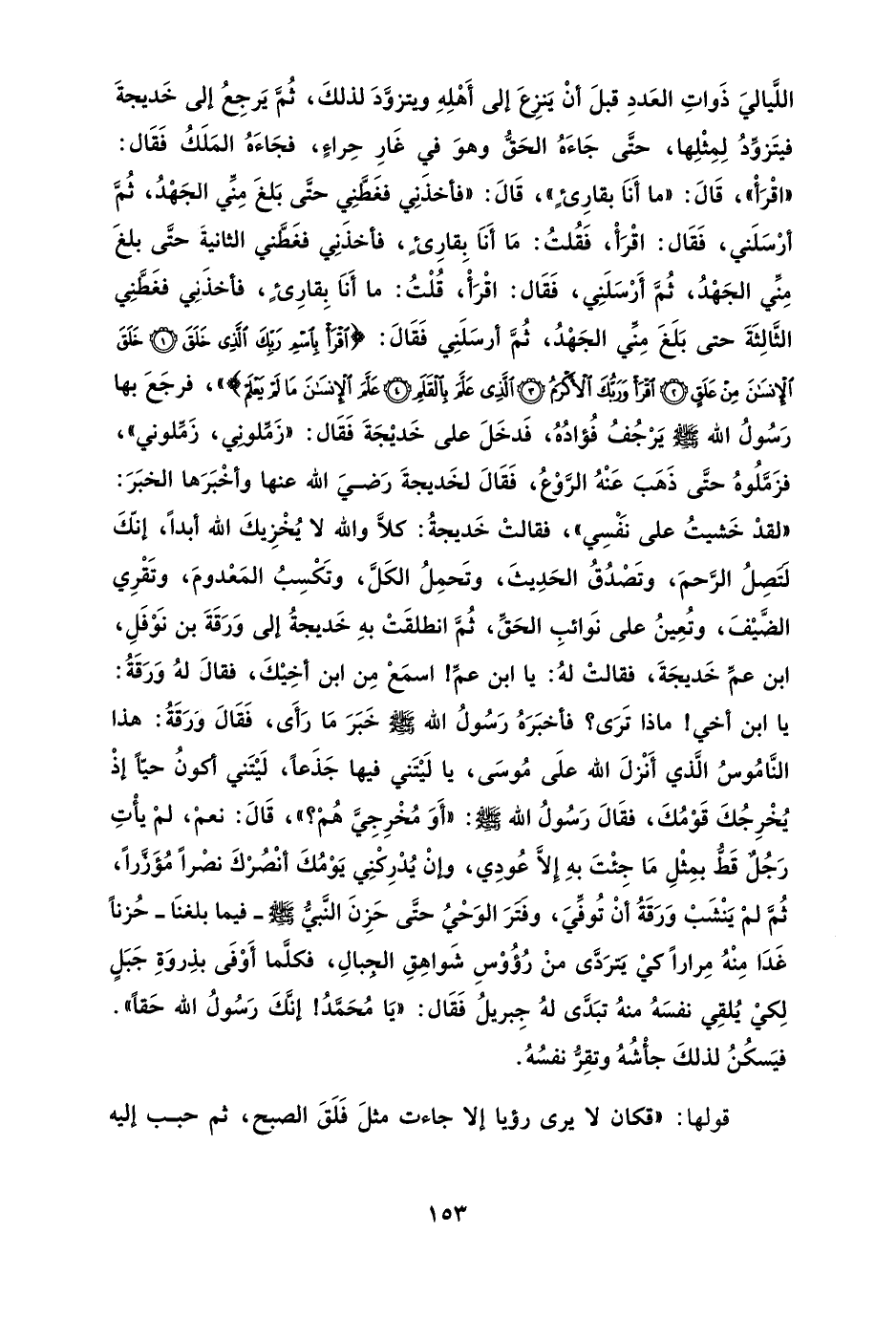 اللَّياليَ ذَواتِ العَددِ قبلَ أنْ يَنزِعَ إلى أَهْلِهِ ويتزوَّدَ لذلكَ، ثُمَّ يَرجِعُ إلى خَديجةَ فيتَزوِّدُ لِمِثْلِها، حتَّى جَاءَهُ الحَقُّ وهوَ في غَارِ حِراءٍ، فجَاءَهُ المَلَكُ فَقَال: "اقْرَأْ"، قَالَ: "ما أَنَا بقارِئٍ"، قَالَ: "فأخذَنِي فغَطَّنِي حتَّى بَلغَ مِنِّي الجَهْدُ، ثُمَّ أرْسَلَني، فَقَال: اقْرَأْ، فَقُلتُ: مَا أَنَا بِقارِئٍ، فأخذَنِي فغَطَّني الثانيةَ حتَّى بلغَ مِنِّي الجَهْدُ، ثُمَّ أَرْسَلَنِي، فَقَال: اقْرَأْ، قُلْتُ: ما أَنَا بِقارِئٍ، فأخذَنِي فغَطَّنِي الثَّالِثَةَ حتى بَلَغَ مِنِّي الجَهْدُ، ثُمَّ أرسَلَنِي فَقَالَ: {اقْرَأْ بِاسْمِ رَبِّكَ الَّذِي خَلَقَ (1) خَلَقَ الْإِنْسَانَ مِنْ عَلَقٍ (2) اقْرَأْ وَرَبُّكَ الْأَكْرَمُ (3) الَّذِي عَلَّمَ بِالْقَلَمِ (4) عَلَّمَ الْإِنْسَانَ مَا لَمْ يَعْلَمْ} "، فرجَعَ بها رَسُولُ الله - صلى الله عليه وسلم - يَرْجُفُ فُؤادُهُ، فَدخَلَ على خَديْجَةَ فَقَال: "زَمِّلونِي، زَمِّلوني"، فزَمَّلُوهُ حتَّى ذَهَبَ عَنْهُ الرَّوْعُ، فَقَالَ لخَديجةَ رَضيَ الله عنها وأخْبَرَها الخبَرَ: "لقدْ خَشيتُ على نَفْسِي"، فقالتْ خَديجةُ: كلاَّ والله لا يُخْزِيكَ الله أبدًا، إنّكَ لَتَصِلُ الرَّحمَ، وتَصْدُقُ الحَدِيثَ، وتَحمِلُ الكَلَّ، وتَكْسِبُ المَعْدومَ، وتَقْرِي الضَّيْفَ، وتُعِينُ على نَوائبِ الحَقِّ، ثُمَّ انطلقَتْ بهِ خَديجةُ إلى وَرَقَةَ بن نَوْفَلِ، ابن عمِّ خَديجَةَ، فقالتْ لهُ: يا ابن عمِّ! اسمَعْ مِن ابن أخِيْكَ، فقالَ لهُ وَرَقَةُ: يا ابن أخي! ماذا تَرَى؟ فأخبَرَهُ رَسُولُ الله - صلى الله عليه وسلم - خَبَرَ مَا رَأَى، فَقَالَ وَرَقَةُ: هذا النَّامُوسُ الَّذي أَنْزلَ الله علَى مُوسَى، يا لَيْتَني فيها جَذَعًا، لَيْتَني أكونُ حيًّا إذْ يُخْرِجُكَ قَوْمُكَ، فقَالَ رَسُولُ الله - صلى الله عليه وسلم -: "أَوَ مُخْرِجِيَّ هُمْ؟ "، قَالَ: نعمْ، لمْ يأْتِ رَجُلٌ قَطُّ بمِثْلِ مَا جِئْتَ بهِ إلَّا عُودِي، وإنْ يُدْرِكْنِي يَوْمُكَ أنْصُرْكَ نصْرًا مُؤَزَّرًا، ثُمَّ لمْ يَنْشَبْ وَرَقَةُ أنْ تُوفِّيَ، وفترَ الوَحْيُ حتَّى حَزِنَ النَّبيُّ - صلى الله عليه وسلم - فيما بلغنَا - حُزنًا غَدَا مِنْهُ مِرارًا كيْ يَترَدَّى منْ رُؤُوْسِ شَواهِقِ الجِبالِ، فكلَّما أَوْفَى بذِروَةِ جَبَلٍ لِكيْ يُلقِي نفسَهُ منهُ تبَدَّى لهُ جِبريلُ فَقَال: "يَا مُحَمَّدُ! إنَّكَ رَسُولُ الله حَقًا". فيَسكُنُ لذلكَ جأْشُهُ وتقِرُّ نفسُهُ.