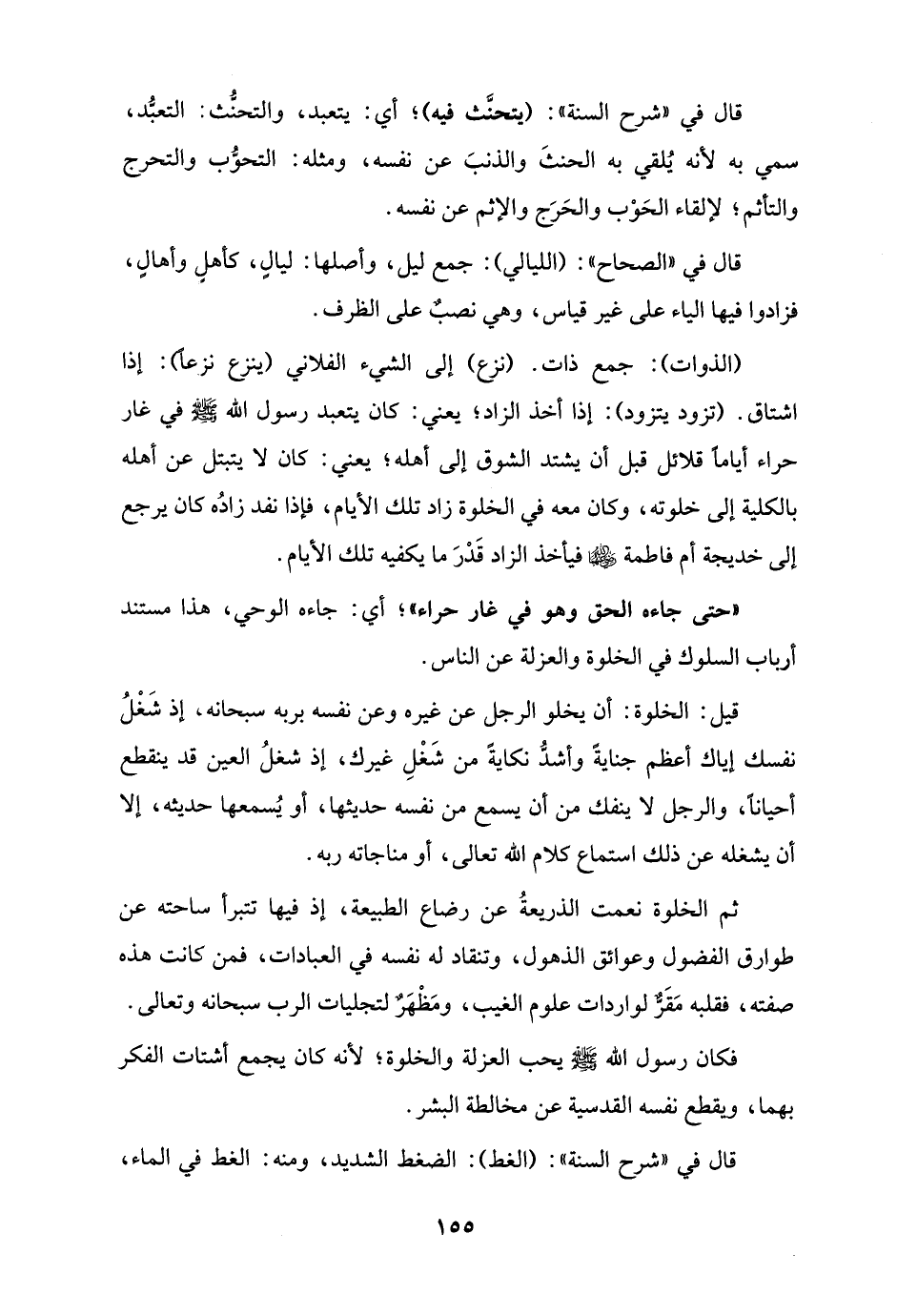 (الذوات): جمع ذات. (نزع) إلى الشيء الفلاني (ينزع نزعًا): إذا اشتاق. (تزود يتزود): إذا أخذ الزاد؛ يعني: كان يتعبد رسول الله - صلى الله عليه وسلم - في غار حراء أيامًا قلائل قبل أن يشتد الشوق إلى أهله؛ يعني: كان لا يتبتل عن أهله بالكلية إلى خلوته، وكان معه في الخلوة زاد تلك الأيام، فإذا نفد زادُه كان يرجع إلى خديجة أم فاطمة - رضي الله عنهما - فيأخذ الزاد قَدْرَ ما يكفيه تلك الأيام.