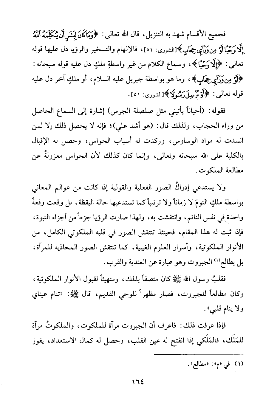 ولا يستدعي إدراكُ الصور الفعلية والقولية إذا كانت من عوالم المعاني بواسطة ملكٍ النومَ لا زمانًا ولا ترتيبًا كما تستدعيها حالة اليقظة، بل وقعت وقعةً واحدة في نفس النائم، وانتقشت به، ولهذا صارت الرؤيا جزءًا من أجزاء النبوة، فإذا ثبت له هذا المقام، فحينئذ تنتقش الصور في قلبه الملكوتي الكامل، من الأنوار الملكوتية، وأسرار العلوم الغيبية، كما تنتقش الصور المحاذية للمرآة، بل يطالع (¬1) الجبروت وهو عبارة عن العندية والقرب.