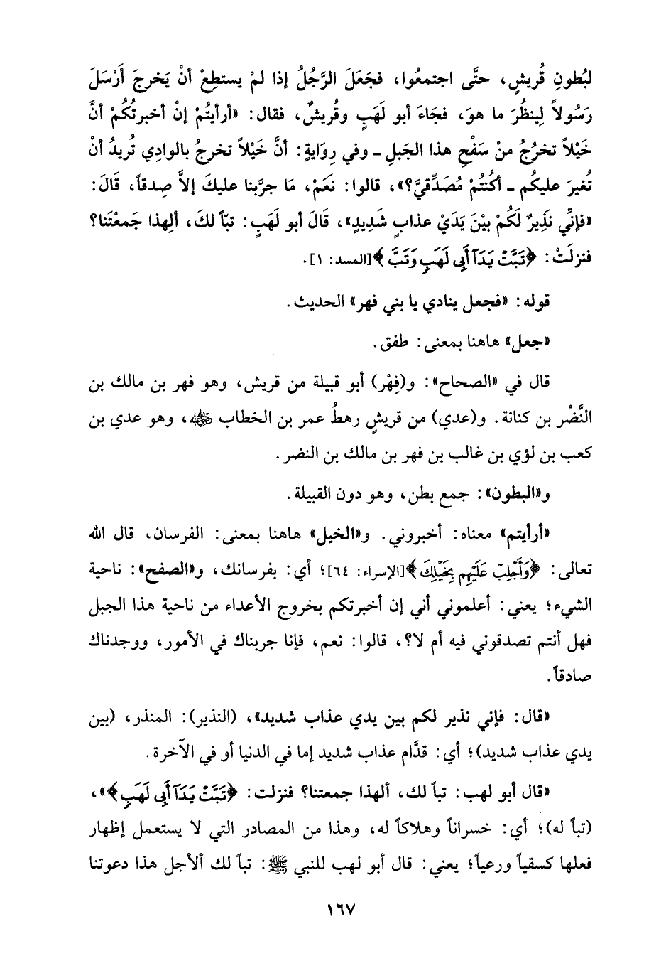 لبُطونِ قُريشٍ، حتَّى اجتمعُوا، فجَعَلَ الرَّجُلُ إذا لمْ يستطِعْ أنْ يَخرجَ أَرْسَلَ رَسُولاً لِينظُرَ ما هوَ، فجَاءَ أبو لَهَبٍ وقُريشٌ، فقال: "أرأيتُمْ إنْ أخبرتُكُمْ أنَّ خَيْلاً تخرُجُ منْ سَفْحِ هذا الجَبلِ - وفي رِوَايةٍ: أنَّ خَيْلاً تخرجُ بالوادِي تُريدُ أنْ تُغيرَ عليكُم - أكُنتُمْ مُصَدِّقيَّ؟ "، قالوا: نَعَمْ، مَا جرَّبنا عليكَ إلَّا صِدقًا، قَالَ: "فإنَّي نَذِيرٌ لَكُمْ بيْنَ يَدَيْ عذابٍ شَدِيدٍ"، قَالَ أبو لَهَبٍ: تبًّا لكَ، ألِهذا جَمعْتَنا؟ فنزلَتْ: {تَبَّتْ يَدَا أَبِي لَهَبٍ وَتَبَّ} [المسد: 1].