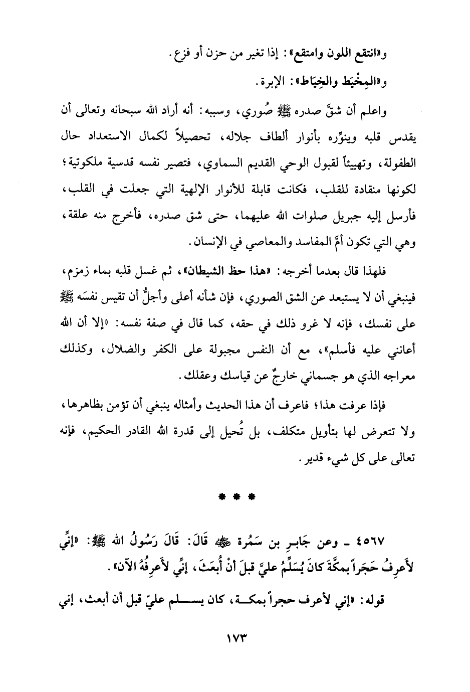 واعلم أن شقَّ صدره - صلى الله عليه وسلم - صُوري، وسببه: أنه أراد الله سبحانه وتعالى أن يقدس قلبه وينوِّره بأنوار ألطاف جلاله، تحصيلًا لكمال الاستعداد حال الطفولة، وتهييئًا لقبول الوحي القديم السماوي، فتصير نفسه قدسية ملكوتية؛ لكونها منقادة للقلب، فكانت قابلة للأنوار الإلهية التي جعلت في القلب، فأرسل إليه جبريل صلوات الله عليهما، حتى شق صدره، فأخرج منه علقة، وهي التي تكون أمَّ المفاسد والمعاصي في الإنسان.