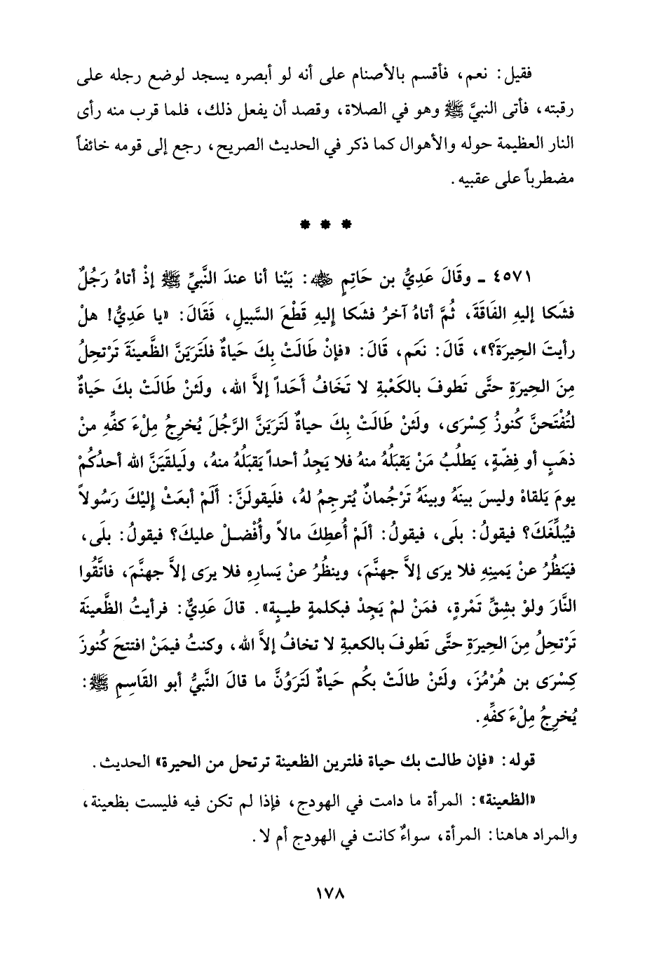 4571 - وقَالَ عَدِيُّ بن حَاتِمٍ - رضي الله عنه -: بَيْنا أنا عندَ النَّبيِّ - صلى الله عليه وسلم - إذْ أتاهُ رَجُلٌ فشَكا إليهِ الفَاقَةَ، ثُمَّ أتاهُ آخرُ فشَكا إليهِ قَطْعَ السَّبيلِ، فَقَالَ: "يا عَدِيُّ! هلْ رأيتَ الحِيرَةَ؟ "، قَالَ: نَعَم، قَالَ: "فإنْ طَالَتْ بِكَ حَياةٌ فلَتَرَيَنَّ الظَّعينَةَ تَرْتحِلُ مِنَ الحِيرَةِ حتَّى تَطوفَ بالكَعْبةِ لا تَخَافُ أَحَدًا إلَّا الله، ولَئنْ طَالَتْ بكَ حَياةٌ لتُفْتَحنَّ كُنوزُ كِسْرَى، ولَئنْ طَالَتْ بِكَ حياةٌ لتَرَيَنَّ الرَّجُلَ يُخرِجُ مِلْءَ كفِّهِ منْ ذهَبٍ أو فِضّةٍ، يَطلُبُ مَنْ يَقبَلُهُ منهُ فلا يَجِدُ أحدًا يَقبَلُهُ منهُ، ولَيلقَيَنَّ الله أحدُكُمْ يومَ يَلقاهْ وليسَ بينَهُ وبينَهُ تَرْجُمانٌ يُترجِمُ لهُ، فلَيقولَنَّ: أَلَمْ أبعَثْ إِليْكَ رَسُولًا فيُبلِّغَكَ؟ فيقولُ: بلَى، فيقولُ: ألَمْ أُعطِكَ مالًا وأُفْضلْ عليكَ؟ فيقولُ: بلَى، فيَنظُرُ عنْ يَمينِهِ فلا يرَى إلَّا جهنَّمَ، وينظُرُ عنْ يَسارِهِ فلا يرَى إلَّا جهنَّمَ، فاتَّقُوا النَّارَ ولوْ بشِقِّ تَمْرةٍ، فمَنْ لمْ يَجدْ فبكلمةٍ طيبةٍ". قالَ عَدِيٌّ: فرأيتُ الظَّعينَة تَرْتحِلُ مِنَ الحِيرَةِ حتَّى تَطوف بالكعبةِ لا تخافُ إلَّا الله، وكنتُ فيمَنْ افتتحَ كُنوزَ كِسْرَى بن هُرْمُزَ، ولَئنْ طالَتْ بكُم حَياةٌ لَتَرَوُنَّ ما قالَ النَّبيُّ أبو القَاسِمِ - صلى الله عليه وسلم -: يُخرِجُ مِلْءَ كفِّهِ.