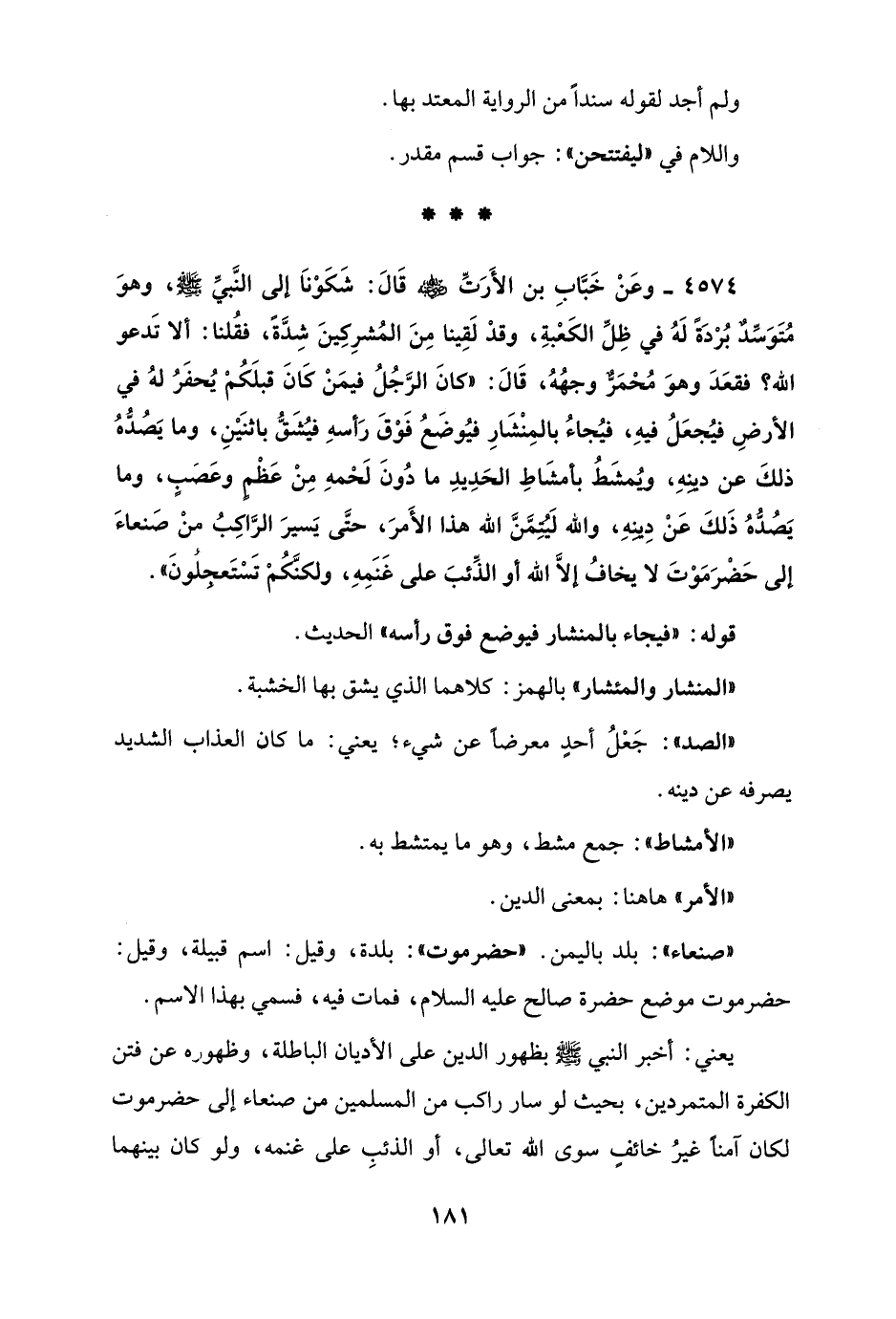 4574 - وعَنْ خَبَّابِ بن الأَرَتِّ - رضي الله عنه - قَالَ: شَكَوْنَا إلى النَّبيِّ - صلى الله عليه وسلم -، وهوَ مُتَوَسِّدٌ بُرْدَةً لَهُ في ظِلِّ الكَعْبةِ، وقدْ لَقِينا مِنَ المُشرِكِينَ شِدَّةً، فقُلنا: ألا تَدعو الله؟ فقعَدَ وهوَ مُحْمَرٌّ وجهُهُ، قَالَ: "كانَ الرَّجُلُ فيمَنْ كانَ قبلَكُمْ يُحفَرُ لهُ في الأرضِ فيُجعَلُ فيهِ، فيُجاءُ بالمِنْشَارِ فيُوضَعُ فَوْقَ رَأسهِ فيُشَقُّ باثنَيْنِ، وما يَصُدُّهُ ذلكَ عن دينِهِ، ويُمشَطُ بأمشَاطِ الحَدِيدِ ما دُونَ لَحْمهِ مِنْ عَظْمٍ وعَصَبٍ، وما يَصُدُّهُ ذَلكَ عَنْ دِينِهِ، والله لَيُتِمَّنَّ الله هذا الأَمرَ، حتَّى يَسيرَ الرَّاكِبُ منْ صَنعاءَ إلى حَضْرَمَوْتَ لا يخافُ إلَّا الله أو الذِّئبَ على غَنَمِهِ، ولكنَّكُمْ تَسْتَعجِلُونَ".