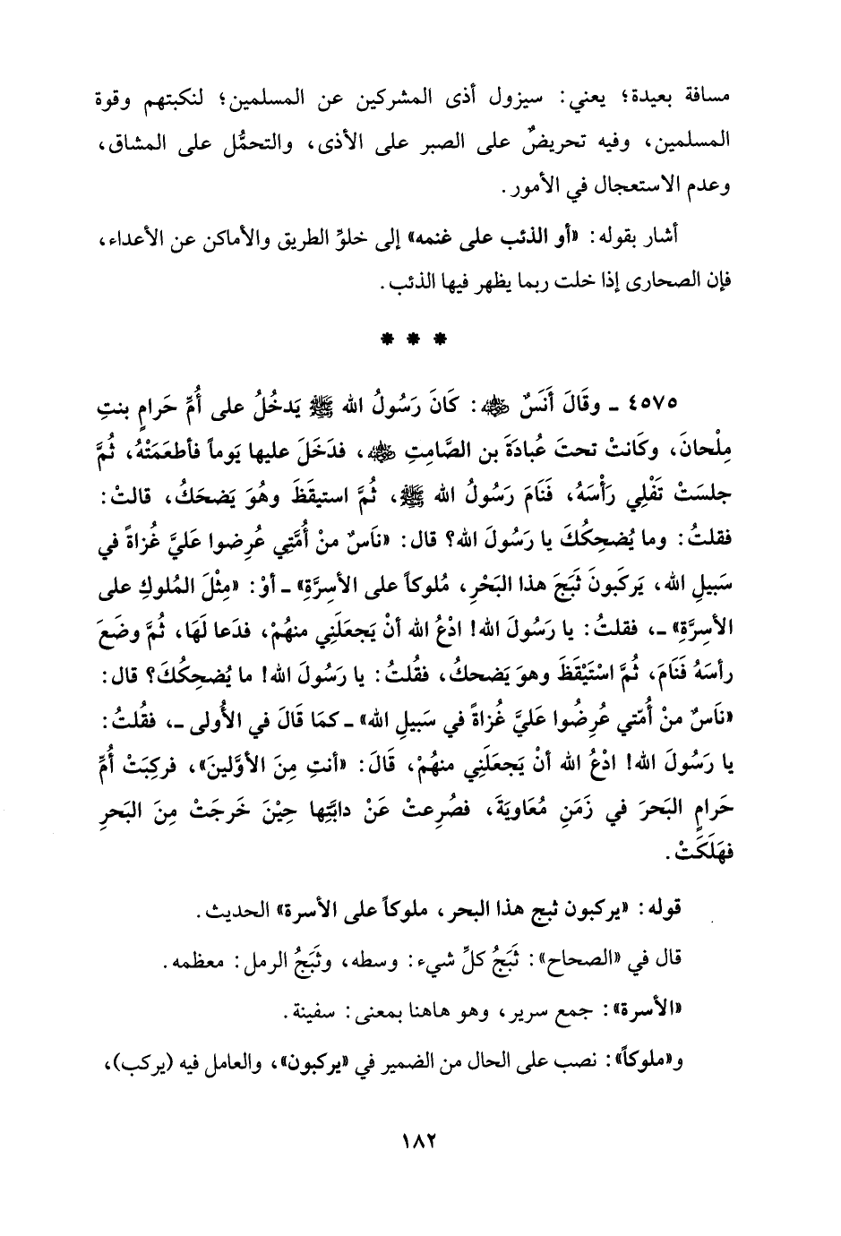 4575 - وقَالَ أَنسٌ - رضي الله عنه -: كَانَ رَسُولُ الله - صلى الله عليه وسلم - يَدخُلُ على أُمَ حَرامٍ بنتِ مِلْحانَ، وكَانتْ تحتَ عُبادَةَ بن الصَّامِتِ - رضي الله عنه -، فدَخَلَ عليها يَومًا فأطعَمَتْهُ، ثُمَّ جلسَتْ تَفْلِي رَأْسَهُ، فَنَامَ رَسُولُ الله - صلى الله عليه وسلم -، ثُمَّ استيقَظَ وهُوَ يَضحَكُ، قالتْ: فقلتُ: وما يُضحِكُكَ يا رَسُولَ الله؟ قال: "نَاسٌ منْ أُمَّتِي عُرِضوا عَليَّ غُزاةً في سَبيلِ الله، يَركَبونَ ثَبَجَ هذا البَحْرِ، مُلوكًا على الأسِرَّةِ" - أوْ: "مِثْلَ المُلوكِ على الأسِرَّةِ" -، فقلتُ: يا رَسُولَ الله! ادع الله أنْ يَجعَلَنِي منهُمْ، فدَعا لَهَا، ثُمَّ وضَعَ رأسَهُ فَنَامَ، ثُمَّ اسْتَيْقَظَ وهوَ يَضحكُ، فقُلتُ: يا رَسُولَ الله! ما يُضحِكُكَ؟ قال: "نَاسٌ منْ أُمّتي عُرِضُوا عَليَّ غُزاةً في سَبيلِ الله" - كمَا قَالَ في الأُولى -، فقُلتُ: يا رَسُولَ الله! ادْعُ الله أنْ يَجعَلَنِي منهُمْ، قَالَ: "أنتِ مِنَ الأوَّلينَ"، فركِبَتْ أُمِّ حَرامٍ البَحرَ في زَمَنِ مُعَاويَةَ، فصُرِعتْ عَنْ دابَّتِها حِيْنَ خَرجَتْ مِنَ البَحرِ فهَلَكَتْ.