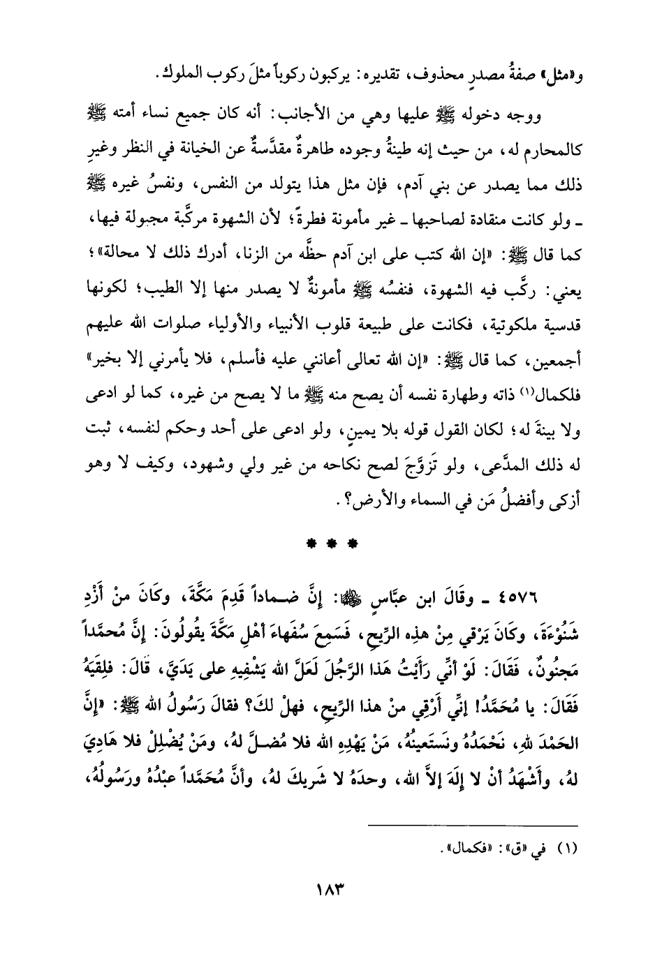 4576 - وقَالَ ابن عبَّاسٍ - رضي الله عنهما -: إنَّ ضمادًا قَدِمَ مَكَّةَ، وكَانَ منْ أَزْدِ شَنُوْءَةَ، وكَانَ يَرْقي مِنْ هذِه الرِّيحِ، فَسَمِعَ سُفَهاءَ أهْلِ مَكَّةَ يقُولُونَ: إنَّ مُحمَّدًا مَجنُونٌ، فَقَالَ: لَوْ أنَّي رَأَيْتُ هَذا الرَّجُلَ لَعَلَّ الله يَشْفِيهِ على يَدَيَّ، قالَ: فلِقَيَهُ فَقَالَ: يا مُحَمَّدُ! إنَّي أَرْقِي منْ هذا الرِّيحِ، فهلْ لكَ؟ فقالَ رَسُولُ الله - صلى الله عليه وسلم -: "إنَّ الحَمْدَ للهِ، نَحْمَدُهُ ونَستَعينُهُ، مَنْ يَهْدِهِ الله فلا مُضلَّ لهُ، ومَنْ يُضْلِلْ فلا هَادِيَ لهُ، وأَشْهَدُ أنْ لا إلَهَ إلَّا الله، وحدَهُ لا شَريكَ لهُ، وأنَّ مُحَمَّدًا عبْدُهُ ورَسُولُهُ،