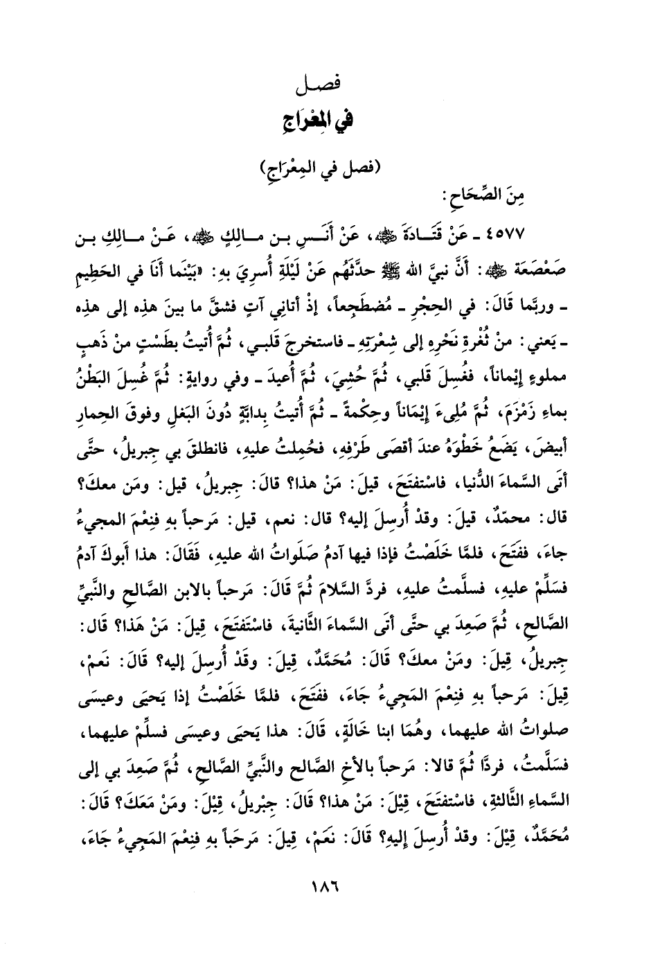 4577 - عَنْ قَتَادَةَ - رضي الله عنه -، عَنْ أَنَسِ بن مالِكٍ - رضي الله عنه -، عَنْ مالِكِ بن صَعْصَعَة - رضي الله عنه -: أَنَّ نبيَّ الله - صلى الله عليه وسلم - حدَّثَهُم عَنْ لَيْلَةِ أُسرِيَ بهِ: "بَيْنَما أَنَا في الحَطِيمِ - وربَّما قَالَ: في الحِجْرِ - مُضطَجِعًا، إذْ أتانِي آتٍ فشقَّ ما بينَ هذِه إلى هذِه - يَعني: منْ ثُغْرةِ نَحْرِهِ إلى شِعْرَتِهِ - فاستخرجَ قَلبي، ثُمَّ أُتيتُ بطَسْتٍ منْ ذَهبٍ مملوءٍ إيْمانًا، فغُسِلَ قَلبي، ثُمَّ حُشِيَ، ثُمَّ أُعيدَ - وفي روايةٍ: ثُمَّ غُسِلَ البَطْنُ بماءِ زَمْزَمَ، ثُمَّ مُلِئَ إيْمَانًا وحِكْمةً - ثُمَّ أُتيتُ بِدابَّةٍ دُونَ البَغلِ وفوقَ الحِمارِ أبيضَ، يَضَعُ خَطْوَهُ عندَ أقصَى طَرْفِهِ، فحُمِلتُ عليهِ، فانطلقَ بي جِبريلُ، حتَّى أتَى السَّماءَ الدُّنيا، فاسْتفتَحَ، قيلَ: مَنْ هذا؟ قالَ: جِبريلُ، قيل: ومَن معكَ؟ قال: محمّدٌ، قيلَ: وقدْ أُرسلَ إليه؟ قال: نعم، قيل: مَرحبًا بهِ فنِعْمَ المجيءُ جاءَ، ففَتَحَ، فلمَّا خَلَصْتُ فإذا فيها آدمُ صَلَواتُ الله عليهِ، فَقَالَ: هذا أَبوكَ آدمُ فسَلِّمْ عليهِ، فسلَّمتُ عليهِ، فردَّ السَّلامَ ثُمَّ قَالَ: مَرحبًا بالابن الصَّالح والنَّبيِّ الصَّالحِ، ثُمَّ صَعِدَ بي حتَّى أتَى السَّماءَ الثَّانيةَ، فاسْتَفتَحَ، قِيلَ: مَنْ هَذا؟ قَال: جِبريلُ، قِيلَ: ومَنْ معكَ؟ قَالَ: مُحَمَّدٌ، قِيلَ: وقَدْ أُرسلَ إليه؟ قَالَ: نَعمْ، قِيلَ: مَرحبًا بهِ فنِعْمَ المَجيءُ جَاءَ، ففَتَحَ، فلمَّا خَلَصْتُ إذا يَحيَى وعيسَى صلواتُ الله عليهما، وهُمَا ابنا خَالَةٍ، قَالَ: هذا يَحيَى وعيسَى فسلِّمْ عليهما، فسَلَّمتُ، فردَّا ثُمَّ قالا: مَرحبًا بالأخِ الصَّالح والنَّبيِّ الصَّالحِ، ثُمَّ صَعِدَ بي إلى السَّماءِ الثَّالثةِ، فاسْتفتَحَ، قِيْلَ: مَنْ هذا؟ قَالَ: جِبْريلُ، قِيْلَ: ومَنْ مَعَكَ؟ قَالَ: مُحَمَّدٌ، قِيْلَ: وقدْ أُرسِلَ إليهِ؟ قَالَ: نَعَمْ، قِيلَ: مَرحَبًا بهِ فنِعْمَ المَجيءُ جَاءَ،