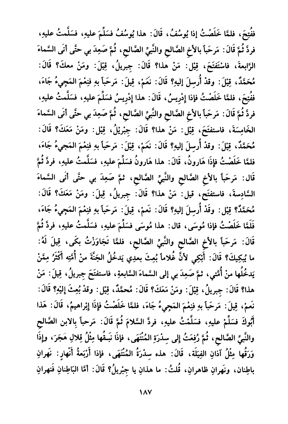ففُتِحَ، فلمَّا خَلَصْتُ إذا يُوسُفُ، قَالَ: هذا يُوسُفُ فسَلِّمَ عليهِ، فسَلَّمتُ عليهِ، فردَّ ثُمَّ قَالَ: مَرحَبًا بالأخِ الصَّالح والنَّبيِّ الصَّالح، ثُمَّ صَعِدَ بي حتَّى أتَى السَّماءَ الرَّابعةَ، فاسْتَفتَحَ، قِيْل: مَنْ هذا؟ قَالَ: جِبريلُ، قِيْلَ: ومَنْ معكَ؟ قَالَ: مُحَمَّدٌ، قِيْلَ: وقدْ أُرسِلَ إليهِ؟ قَالَ: نَعَمْ، قِيلَ: مَرحَبًا بهِ فنِعْمَ المَجيءُ جَاءَ، ففُتِحَ، فلمَّا خَلَصْتُ فإذا إِدْرِيسُ، قَالَ: هذا إِدْرِيسُ فسَلِّمَ عليهِ، فسَلَّمتُ عليهِ، فردَّ ثُمَّ قَالَ: مَرحَبًا بالأخِ الصَّالحِ والنَّبيِّ الصَّالحِ، ثُمَّ صَعِدَ بي حتَّى أتَى السَّماءَ الخَامِسَةَ، فاستفتَحَ، قِيْل: مَنْ هذا؟ قَالَ: جِبْريْلُ، قِيْل: ومَنْ مَعَكَ؟ قَالَ: مُحَمَّدٌ، قِيْلَ: وقدْ أُرسِلَ إليهِ؟ قَالَ: نَعَمْ، قِيْلَ: مَرحَبًا بهِ فنِعْمَ المَجيءُ جَاءَ، فلمَّا خَلَصْتُ فإِذَا هَارونُ، قَالَ: هذا هَارونُ فسَلِّمَ عليهِ، فسَلَّمتُ عليهِ، فردَّ ثُمَّ قَال: مَرحَبًا بالأخِ الصَّالحِ والنَّبيِّ الصَّالحِ، ثمَّ صَعِدَ بي حتَّى أتَى السَّماءَ السَّادِسةَ، فاستفتَح، قيل: مَنْ هذا؟ قَالَ: جِبريلُ، قِيلَ: ومَنْ مَعَكَ؟ قَالَ: مُحَمَّدٌ؟ قِيْل: وقَدْ أُرسِلَ إليهِ؟ قَالَ: نَعمْ، قِيلَ: مَرحَبًا بهِ فنِعْمَ المَجيءُ جَاءَ، فَلَمَّا خَلَصْتُ فإذا مُوسَى، قال: هذا مُوسَى فسَلِّمَ عليهِ، فسَلَّمتُ عليهِ، فردَّ ثُمَّ قَالَ: مَرحَبًا بالأخِ الصَّالحِ والنَّبيِّ الصَّالحِ، فلمَّا تَجَاوَزْتُ بكَى، قِيلَ لَهُ: ما يُبكِيكَ؟ قَالَ: أَبْكِي لأنَّ غُلامًا بُعِثَ بعدِي يَدخُلُ الجَنَّةَ منْ أُمَّتِه أَكْثَرُ مِمَّنْ يَدخُلُها منْ أُمَّتي، ثمَّ صَعِدَ بي إلى السَّماءَ السَّابعةِ، فاستفتَحَ جِبريلُ، قِيلَ: مَنْ هذا؟ قَالَ: جِبريلُ، قِيْلَ: ومَنْ مَعَكَ؟ قَالَ: مُحمَّدٌ، قِيْل: وقدْ بُعِثَ إِليْهِ؟ قَالَ: نَعمْ، قِيلَ: مَرحَبًا بهِ فنِعْمَ المَجيءُ جَاءَ، فلمَّا خَلَصْتُ فإِذَا إِبْراهيمُ، قَالَ: هَذا أَبُوكَ فسَلِّمْ عليهِ، فسَلَّمْتُ عليهِ، فردَّ السَّلامَ ثُمَّ قَالَ: مَرحبًا بِالابن الصَّالحِ والنَّبيِّ الصَّالحِ، ثُمَّ رُفِعَتُ إِلى سِدْرَةِ المُنْتَهَى، فإذَا نبَقُها مِثْلُ قِلالِ هَجَرَ، وإذَا وَرَقُها مِثْلُ آذانِ الفِيَلَة، قَالَ: هذه سِدْرَةُ المُنْتَهَى، فإذا أَرْبَعةُ أَنْهارٍ: نهَرانِ باطِنان، ونَهرانِ ظاهرانِ، قُلتُ: ما هذانِ يا جِبْريلُ؟ قَالَ: أمَّا البَاطِنانِ فَنهرانِ