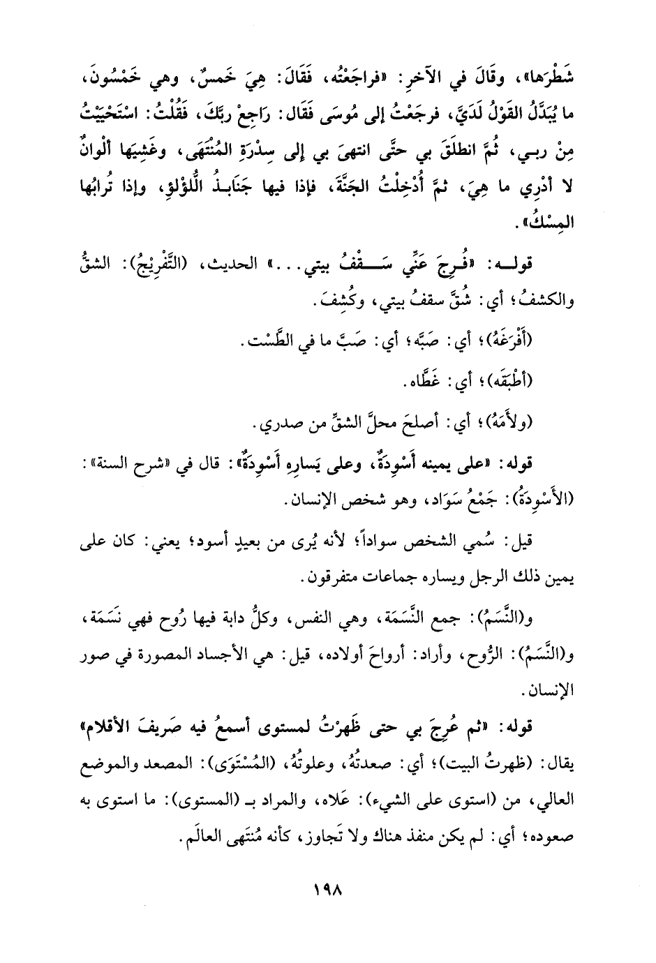 قوله: "ثم عُرِجَ بي حتى ظَهرْتُ لمستوى أسمعُ فيه صَريفَ الأقلام" يقال: (ظهرتُ البيت)؛ أي: صعدتُهُ، وعلوتُهُ، (المُسْتَوَى): المصعد والموضع العالي، من (استوى على الشيء): عَلاه، والمراد بـ (المستوى): ما استوى به صعوده؛ أي: لم يكن منفذ هناك ولا تَجاوز، كأنه مُنتَهى العالَم.