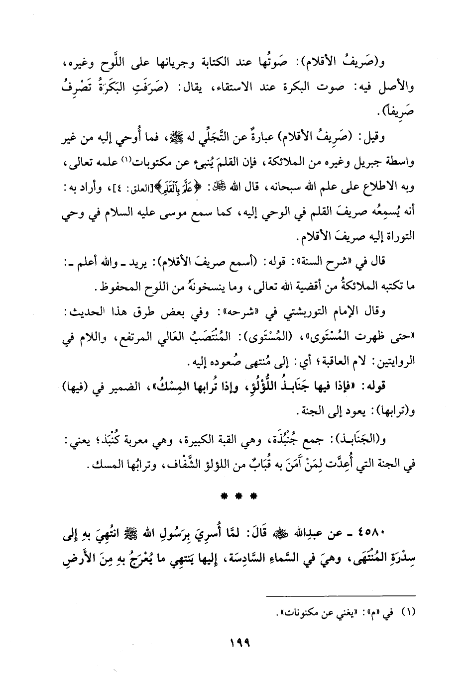 4580 - عن عبدِ الله - رضي الله عنه - قَالَ: لمَّا أُسرِيَ بِرَسُولِ الله - صلى الله عليه وسلم - انتُهِيَ بهِ إلى سِدْرَةِ المُنْتَهَى، وهيَ في السَّماءِ السَّادِسَة، إليها يَنتهِي ما يُعْرَجُ بهِ مِنَ الأَرضِ
