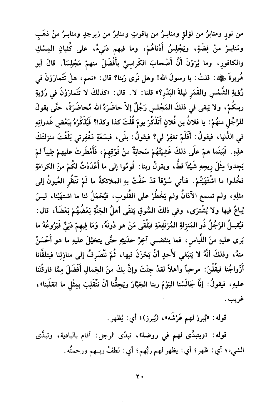 من نورٍ ومنابرُ من لؤلؤٍ ومنابرُ من ياقوتٍ ومنابرُ من زبرجدٍ ومنابرُ منْ ذهَبٍ ومَنابرُ منْ فِضّةٍ، ويَجْلِسُ أَدْناهُمْ، وما فيهم دَنيءٌ، على كُثبانِ المِسْكِ والكافورِ، وما يُرَوْنَ أَنَّ أَصْحابَ الكَراسِيِّ بأَفْضَلَ منهمْ مَجْلِسًا. قالَ أبو هُريرةَ - رضي الله عنه -: قلتُ: يا رسولَ الله! وهل نرَى رَبنا؟ قال: "نعم، هلْ تَتَمارَوْنَ في رُؤيةِ الشَّمْسِ والقَمَرِ ليلةَ البَدْرِ؟ " قلنا: لا. قال: "كذلكَ لا تَتَمارَوْنَ في رُؤيةِ ربكُمْ، ولا يَبقى في ذلكَ المَجْلسِ رَجُلٌ إلّا حاضَرَهُ الله مُحاضَرَةً، حتَّى يقولَ للرَّجُلِ منهُمْ: يا فلانُ بن فُلانٍ أَتَذْكُرَ يومَ قُلْتَ كذا وكذا؟ فَيُذَكِّرُهُ ببَعْضِ غَدراتِهِ في الدُّنيا، فيقولُ: أَفَلَمْ تغفِرْ لي؟ فيقولُ: بلَى، فبسَعَةِ مَغْفِرتي بَلَغْتَ منزلتَكَ هذِهِ. فَبَينَما همْ علَى ذلكَ غَشِيَتُهُمْ سَحابَةٌ منْ فَوْقِهِمْ، فَأَمْطَرتْ عليهمْ طِيبًا لمْ يَجدوا مِثْلَ رِيحِهِ شَيْئًا قطُّ، ويقولُ ربنا: قُومُوا إلى ما أَعْدَدْتُ لكُمْ منَ الكرامَةِ فخُذوا ما اشْتَهَيْتُمْ. فنأتي سُوْقًا قدْ حَفَّتْ بهِ الملائكةُ ما لَمْ تَنْظُرِ العُيونُ إلى مثلِهِ، ولم تسمع الآذانُ ولم يَخْطُرْ على القُلوبِ، فيُحْمَلُ لنا ما اشتهَيْنا، ليسَ يُباعُ فيها ولا يُشْترَى، وفي ذلكَ السُّوقِ يَلقَى أهلُ الجَنَّةِ بَعْضُهُمْ بَعْضًا، قال: فيُقبلُ الرَّجُلُ ذُو المَنزِلةِ المُرْتَفِعَةِ فيَلْقَى مَنْ هو دُونَهُ، وَمَا فِيهِمْ دَنِيٌّ فَيَرُوعُهُ ما يَرى عليهِ منَ اللِّباسِ، فما ينقضي آخِرُ حدَيثِهِ حتَّى يتخيَّلَ عليهِ ما هو أَحْسَنُ منهُ، وذلكَ أنَّهُ لا يَنبَغي لأَحدٍ أنْ يَحْزَنَ فيها، ثُمَّ نَنْصَرِفُ إلى منازِلِنا فيتلقَّانا أَزْواجُنا فيقُلْنَ: مرحبًا وأهلًا لقدْ جِئْتَ وإنَّ بكَ منَ الجَمالِ أَفْضَلَ مِمَّا فارقْتَنا عليهِ، فيقولُ: إنَّا جَالَسْنا اليَوْمَ ربنا الجَبَّارَ ويَحِقُّنا أنْ نَنْقَلِبَ بمِثْلِ ما انقلَبنا"، غريب.