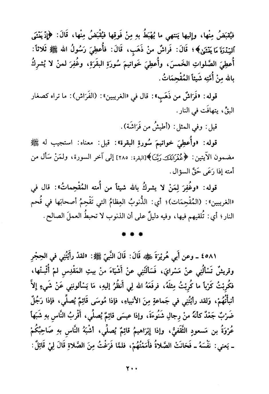فيُقبَضُ مِنْها، وإِليها يَنتهي ما يُهْبَطُ بهِ مِنْ فَوقِها فيُقْبَضُ مِنْها، قَالَ: {إِذْ يَغْشَى السِّدْرَةَ مَا يَغْشَى}؛ قَالَ: فَراشٌ منْ ذَهَبٍ، قَالَ: فأُعطِيَ رَسُولُ الله - صلى الله عليه وسلم - ثَلاثًا: أُعطِيَ الصَّلواتِ الخَمسَ، وأُعطِيَ خَواتيمَ سُورَةِ البقَرَةِ، وغُفِرَ لمنْ لا يُشرِكُ بالله مِنْ أُمَّتِه شَيئًا المُقْحِمَاتُ.