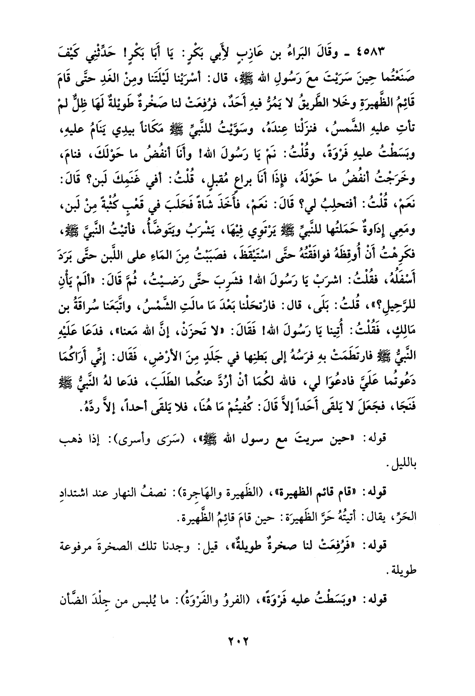 4583 - وقَالَ البَراءُ بن عَازِبٍ لأِبي بَكْرٍ: يَا أَبَا بَكْرٍ! حَدِّثْنِي كَيْفَ صَنَعْتُما حِينَ سَرَيْتَ معَ رَسُولِ الله - صلى الله عليه وسلم -، قال: أسْرَيْنا لَيْلَتَنا ومِنْ الغَدِ حتَّى قَامَ قَائِمُ الظَّهيرَةِ وخَلا الطَّريقُ لا يَمُرُّ فيهِ أَحَدٌ، فرُفِعَتْ لنا صَخْرةٌ طَويْلةٌ لَهَا ظِلٌّ لمْ تأتِ عليهِ الشَّمسُ، فنزَلْنا عِندَهُ، وسَوَّيتُ للنَّبيِّ - صلى الله عليه وسلم - مَكَانًا بيدِي يَنَامُ عليهِ، وبَسَطْتُ عليهِ فَرْوَةً، وقُلْتُ: نَمْ يَا رَسُولَ الله! وأَنَا أنفُضُ ما حَوْلَكَ، فنامَ، وخَرَجْتُ أنفُضُ ما حَوْلَهُ، فإِذَا أَنَا براعٍ مُقبلٍ، قُلْتُ: أفي غَنَمِكَ لَبن؟ قَالَ: نَعَمْ، قُلْتُ: أفتحلِبُ لي؟ قَالَ: نَعَمْ، فأَخَذَ شَاةً فَحَلَبَ في قَعْبٍ كُثْبةً مِنْ لَبن، ومَعِي إِدَاوةٌ، حَمَلتُها للنَّبيِّ - صلى الله عليه وسلم - يَرْتَوِي فِيْهَا، يَشْرَبُ ويَتَوضَّأُ، فأتيْتُ النَّبيَّ - صلى الله عليه وسلم -، فكَرِهْتُ أَنْ أُوقِظَهُ فوافَقْتُهُ حتَّى اسْتَيْقَظَ، فصَبَبْتُ مِنَ المَاءِ على اللَّبن حتَّى بَرَدَ أَسْفَلُهُ، فقُلْتُ: اشرَبْ يَا رَسُولَ الله! فشَرِبَ حتَّى رَضيْتُ، ثُمَّ قَالَ: "ألَمْ يَأْنِ للرَّحِيلِ؟ "، قُلتُ: بَلَى، قال: فارْتحَلْنا بَعْدَ مَا مالَتِ الشَّمْسُ، واتَّبَعَنا سُراقَةُ بن مَالِكٍ، فَقُلْتُ: أُتِينا يَا رَسُولَ الله! فَقَالَ: "لا تَحزَنْ، إنَّ الله مَعنا"، فدَعَا عَلَيْهِ النَّبيُّ - صلى الله عليه وسلم - فارتَطَمَتْ بهِ فرَسُهُ إلى بَطنِها في جَلَدٍ مِنَ الأرْضِ، فَقَال: إِنِّي أَرَاكُمَا دَعُوتُما عَلَيَّ فادعُوَا لي، فالله لكُمَا أنْ أرُدَّ عنكُما الطَلَبَ، فدَعا لهُ النَّبيُّ - صلى الله عليه وسلم - فَنَجَا، فجَعَلَ لا يَلقَى أَحَدًا إلاَّ قَالَ: كُفيتُمْ مَا هُنَا، فلا يَلقَى أحدًا، إلاَّ ردَّهُ.