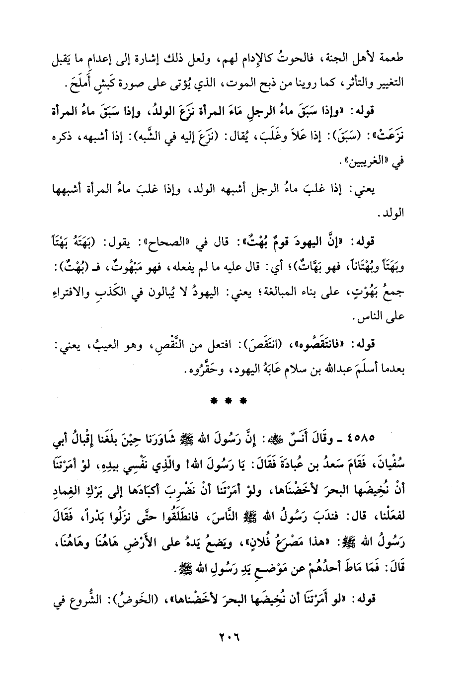 4585 - وقَالَ أَنَسٌ - رضي الله عنه -: إِنَّ رَسُولَ الله - صلى الله عليه وسلم - شَاوَرَنا حِيْنَ بلَغَنا إِقْبالُ أبي سُفْيانَ، فَقَامَ سَعدُ بن عُبادَةَ فَقَالَ: يَا رَسُولَ الله! والّذِي نَفْسِي بيدِهِ، لوْ أمَرْتَنَا أنْ نُخِيضَها البحرَ لأخَضْنَاها، ولوْ أمَرْتَنا أنْ نضرِبَ أكبَادَها إلى بَرْكِ الغِمادِ لفعَلْنا، قال: فندَبَ رَسُولُ الله - صلى الله عليه وسلم - النَّاسَ، فانطَلَقُوا حتَّى نزَلُوا بَدْرًا، فَقَالَ رَسُولُ الله - صلى الله عليه وسلم -: "هذا مَصْرَعُ فُلانٍ"، ويَضعُ يَدهُ على الأَرْضِ هَا هُنَا وهَا هُنَا، قَالَ: فَمَا مَاطَ أحدُهُمْ عن مَوْضعِ يَدِ رَسُولِ الله - صلى الله عليه وسلم -.