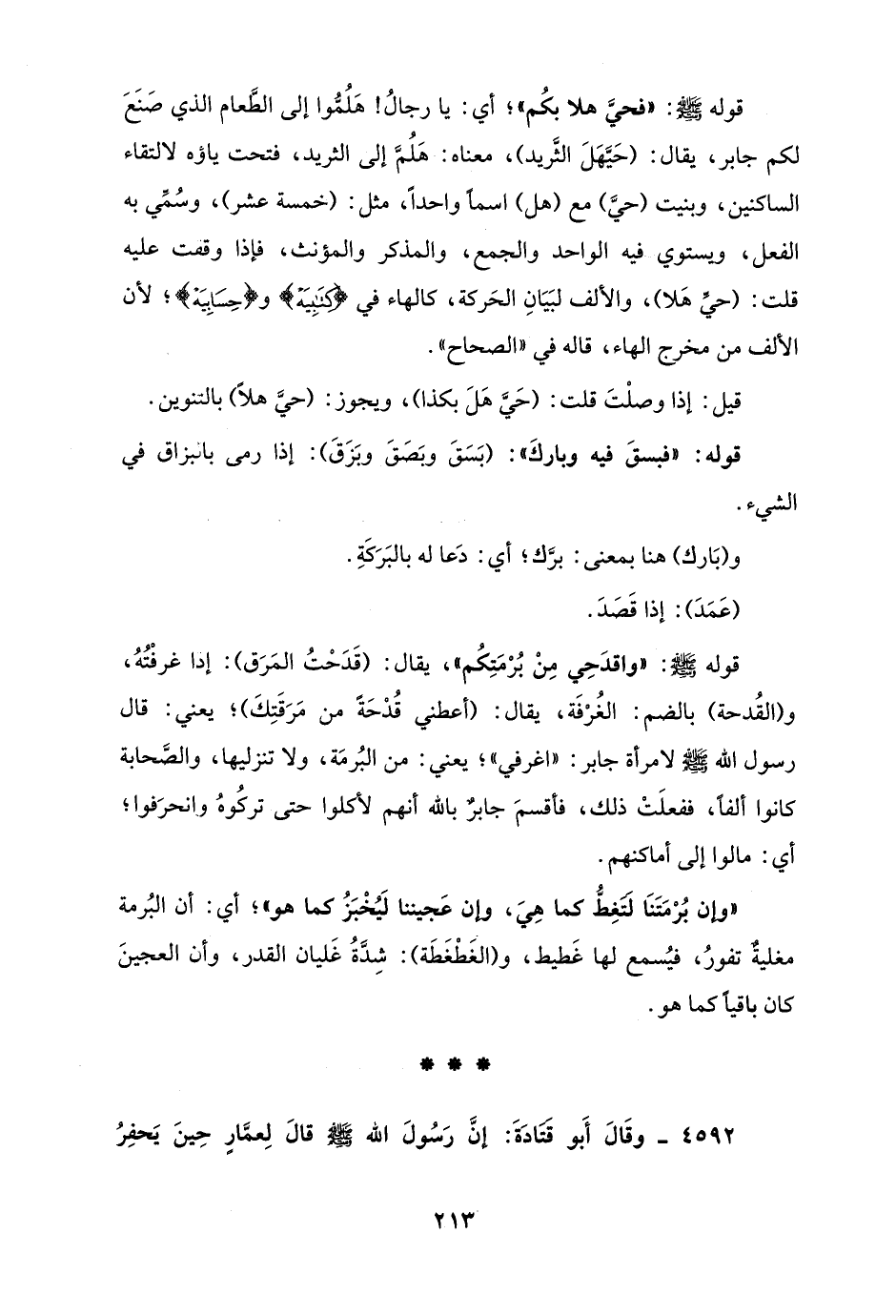 قوله - صلى الله عليه وسلم -: "واقدَحِي مِنْ بُرْمَتِكُم"، يقال: (قَدَحْتُ المَرَق): إذا غرفْتُهُ، و (القُدحة) بالضم: الغُرْفَة، يقال: (أعطني قُدْحَةً من مَرَقَتِكَ)؛ يعني: قال رسول الله - صلى الله عليه وسلم - لامرأة جابر: "اغرفي"؛ يعني: من البُرمَة، ولا تنزليها، والصَّحابة كانوا ألفًا، ففعلَتْ ذلك، فأقسمَ جابرٌ بالله أنهم لأكلوا حتى تركُوهُ وانحرَفوا؛ أي: مالوا إلى أماكنهم.