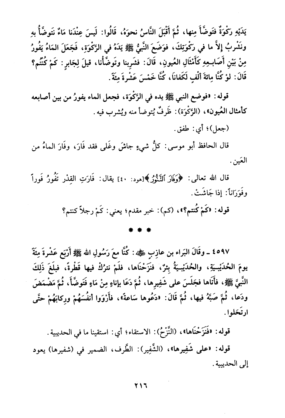 4597 - وقَالَ البَراء بن عازِبٍ - رضي الله عنه -: كُنَّا معَ رَسُولِ الله - صلى الله عليه وسلم - أَرْبَع عَشْرةَ مِئَةً يومَ الحُدَيْبيَةِ، والحُدَيْبيَةُ بِئرٌ، فنَزَحْنَاها، فلَمْ نترُكْ فيها قَطْرةً، فبلَغَ ذَلِكَ النَّبيَّ - صلى الله عليه وسلم -، فأَتَاها فجَلَسَ على شَفِيرِها، ثُمَّ دَعَا بإناءٍ مِنْ مَاءٍ فتوضَّأَ، ثُمَّ مَضْمَضَ ودَعا، ثُمَّ صَبَّهُ فيها، ثُمَّ قَالَ: "دَعُوها سَاعةً"، فأَرْوَوا أنفُسَهُمْ ورِكابَهُمْ حتَّى ارتَحَلوا.