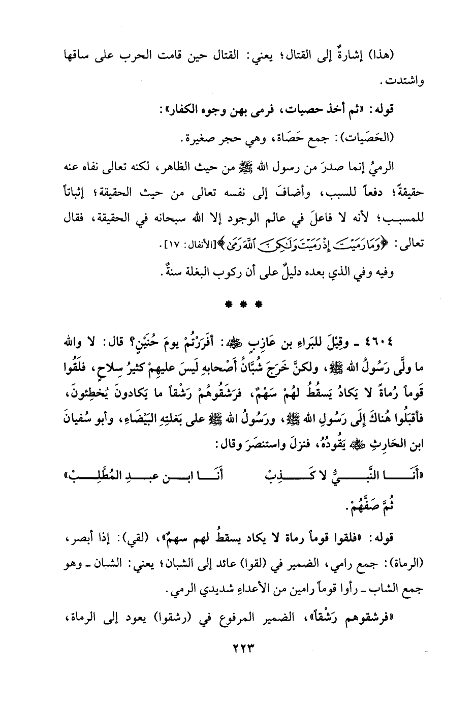 4604 - وقِيْلَ للبَراءِ بن عَازِبٍ - رضي الله عنه -: أفَرَرْتُمْ يومَ حُنَيْنٍ؟ قال: لا والله ما ولَّى رَسُولُ الله - صلى الله عليه وسلم -، ولكنَّ خَرَجَ شُبَّانُ أَصْحابهِ لَيسَ عليهِم كثيرُ سِلاحٍ، فلَقُوا قَومًا رُماةً لا يَكادُ يَسقُطُ لهُمْ سَهْمٌ، فرَشَقُوهُمْ رَشْقًا ما يَكادونَ يُخطِئونَ، فأقبَلُوا هُناكَ إِلَى رَسُولِ الله - صلى الله عليه وسلم -، ورَسُولُ الله - صلى الله عليه وسلم - على بَغلتِهِ البَيْضَاءِ، وأبو سُفيانَ ابن الحَارِثِ - رضي الله عنه - يَقُودُهُ، فنزلَ واستنصَرَ وقال: