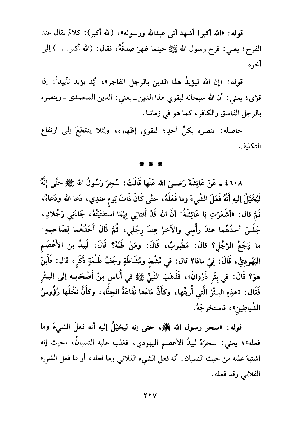 4608 - عَنْ عَائِشَةَ رَضيَ الله عَنْها قَالَتْ: سُحِرَ رَسُولُ الله - صلى الله عليه وسلم - حتَّى إِنَّهُ لَيُخَيَّلُ إليهِ أَنَّهُ فَعَلَ الشَّيءَ وما فَعَلَهُ، حتَّى كَانَ ذَاتَ يَومٍ عندِي، دَعا الله ودَعاهُ، ثُمَّ قال: "أشَعَرْتِ يَا عَائِشَةُ! أنَّ الله قَدْ أَفتانِي فِيْمَا استفتَيْتُهُ، جَاءَنِي رَجُلانِ، جَلَسَ أحدُهُما عندَ رأْسِي والآخرُ عِندَ رِجْلِي، ثُمَّ قَالَ أَحَدُهُما لِصَاحبهِ: ما وَجَعُ الرَّجُلِ؟ قالَ: مَطْبوبٌ، قَالَ: ومَنْ طَبَّهُ؟ قَالَ: لَبيدُ بن الأَعْصَمِ اليَهُودِيُّ، قَالَ: فِيْ ماذا؟ قال: في مُشْطٍ ومُشَاطَةٍ وجُفِّ طَلْعَةٍ ذَكَرٍ، قال: فَأَينَ هوَ؟ قَالَ: في بِئْرِ ذَرْوانَ"، فَذَهَبَ النَّبيُّ - صلى الله عليه وسلم - في أُناسٍ مِنْ أَصْحَابه إلى البئْرِ فَقَال: "هذِهِ البئْرُ الَّتي أُريتُها، وكأَنَّ مَاءَها نقُاعَةُ الحِنَّاءِ، وكأَنَّ نَخْلَها رُؤُوسُ الشَّياطِينِ"، فاستخرجَهُ.