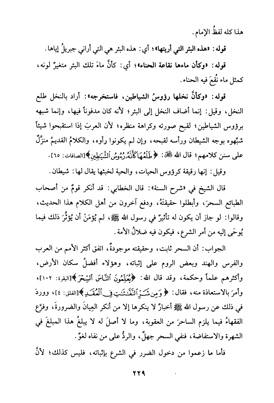 قال الشيخ في "شرح السنة": قال الخطابي: قد أنكر قومٌ من أصحاب الطبائع السحرَ، وأبطلوا حقيقتَهُ، ودفع آخرون من أهل الكلام هذا الحديث، وقالوا: لو جاز أن يكون له تأثيرٌ في رسول الله - صلى الله عليه وسلم -، لم يُؤمَنْ أن يُؤثِّرَ ذلك فيما يُوحَى إليه من أمر الشرع، فيكون فيه ضلالُ الأمة.