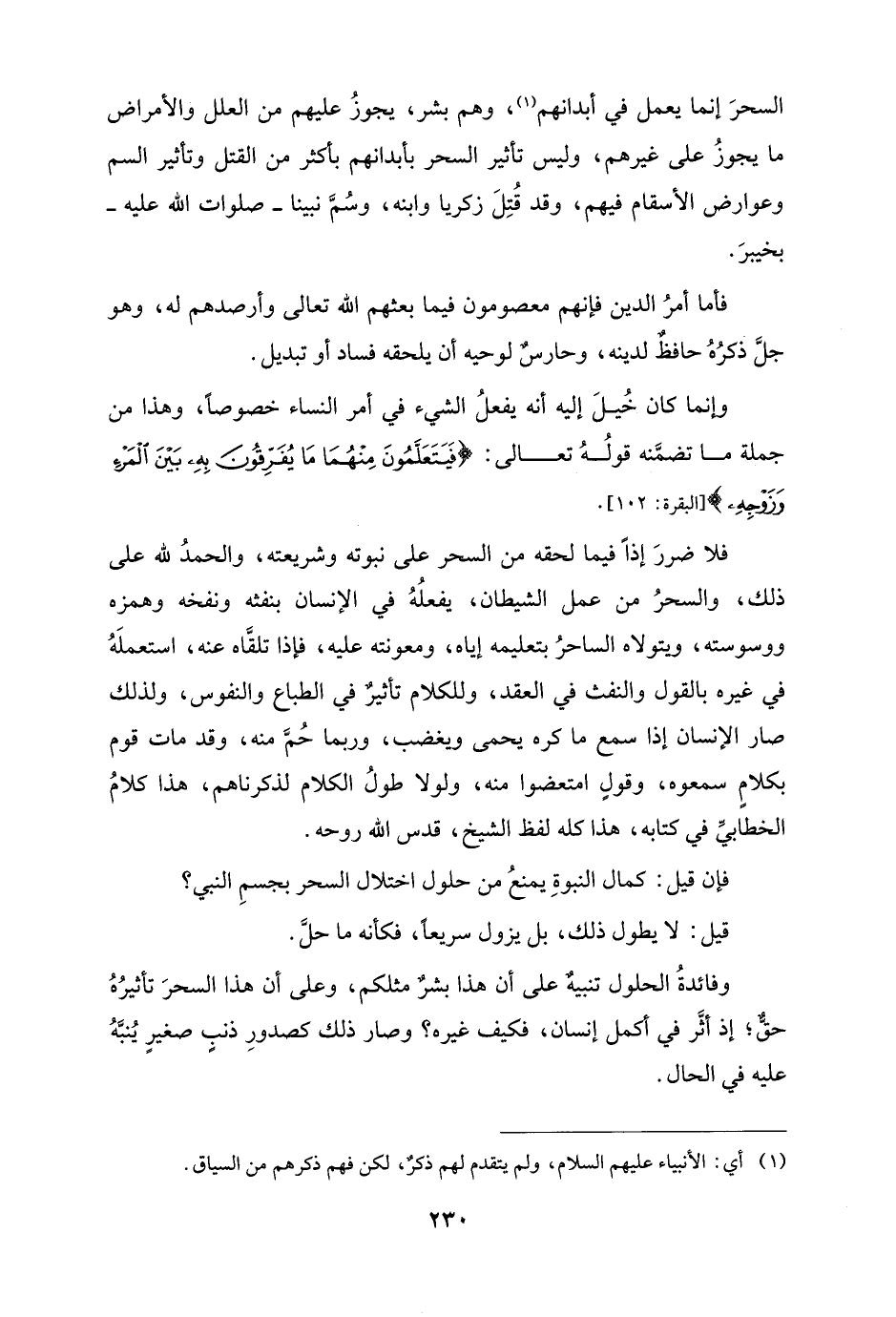 فلا ضررَ إذًا فيما لحقه من السحر على نبوته وشريعته، والحمدُ لله على ذلك، والسحرُ من عمل الشيطان، يفعلُهُ في الإنسان بنفثه ونفخه وهمزه ووسوسته، ويتولاه الساحرُ بتعليمه إياه، ومعونته عليه، فاذا تلقَّاه عنه، استعملَهُ في غيره بالقول والنفث في العقد، وللكلام تأثيرٌ في الطباع والنفوس، ولذلك صار الإنسان إذا سمع ما كره يحمى ويغضب، وربما حُمَّ منه، وقد مات قوم بكلامٍ سمعوه، وقولٍ امتعضوا منه، ولولا طولُ الكلام لذكرناهم، هذا كلامُ الخطابيِّ في كتابه، هذا كله لفظ الشيخ، قدس الله روحه.