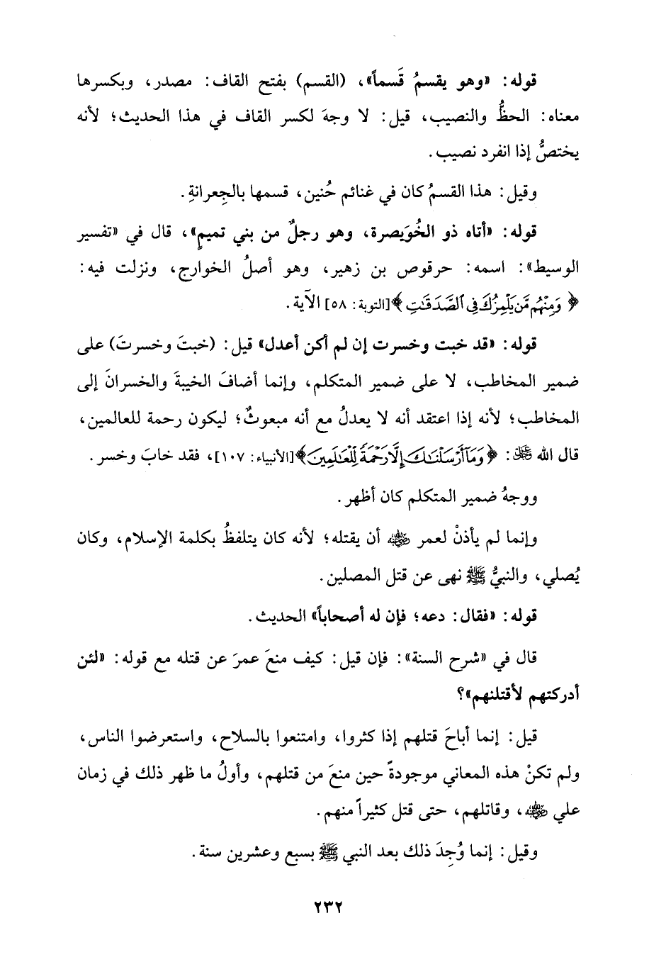 قوله: "قد خبت وخسرت إن لم أكن أعدل" قيل: (خبتَ وخسرتَ) على ضمير المخاطب، لا على ضمير المتكلم، وإنما أضافَ الخيبةَ والخسرانَ إلى المخاطب؛ لأنه إذا اعتقد أنه لا يعدلُ مع أنه مبعوثٌ؛ ليكون رحمة للعالمين، قال الله - عز وجل -: {وَمَا أَرْسَلْنَاكَ إِلَّا رَحْمَةً لِلْعَالَمِينَ} [الأنبياء: 107]، فقد خابَ وخسر.