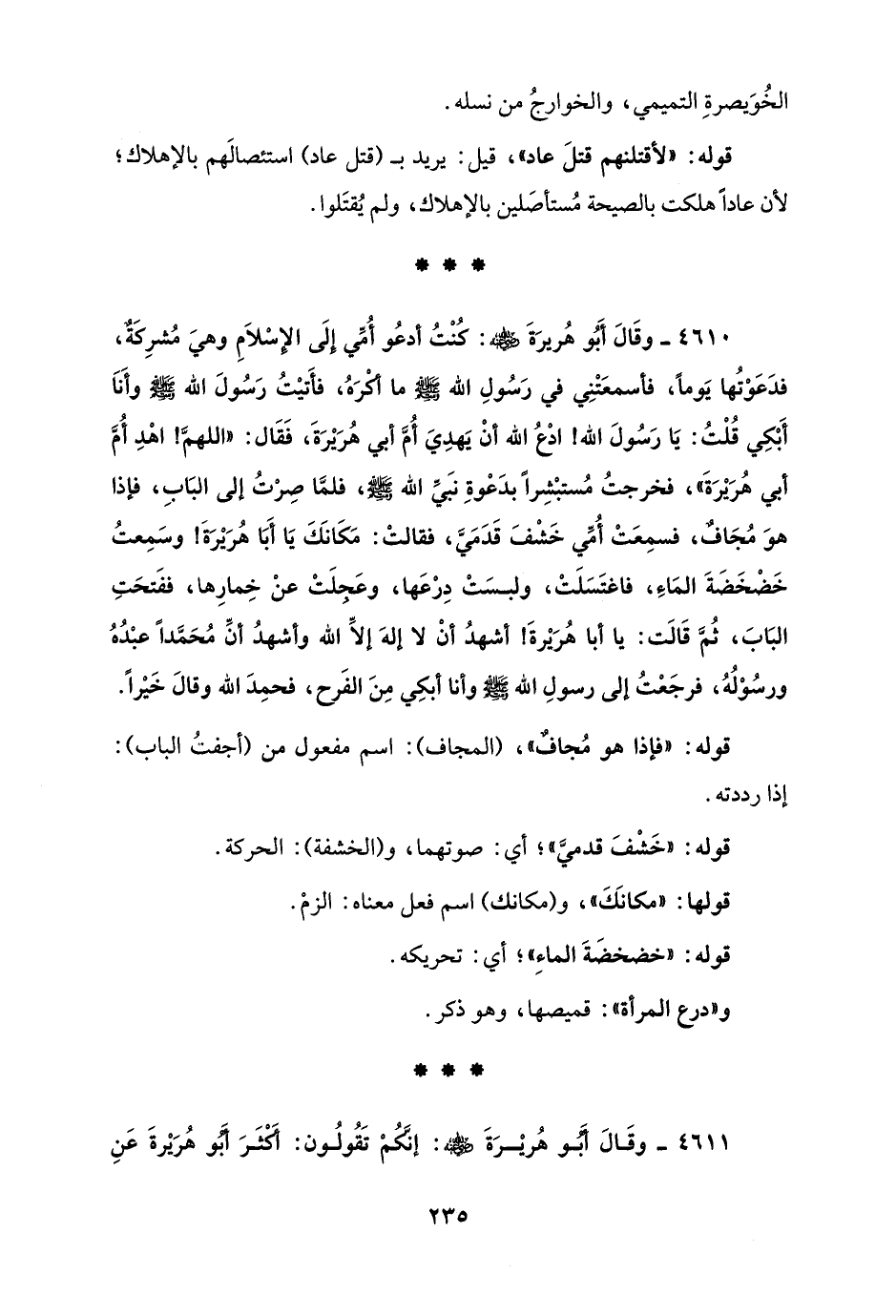 4610 - وقَالَ أَبُو هُريرَةَ - رضي الله عنه -: كُنْتُ أدعُو أُمِّي إِلَى الإِسْلاَمِ وهيَ مُشرِكَةٌ، فدَعَوْتُها يَومًا، فأسمعَتْنِي في رَسُولِ الله - صلى الله عليه وسلم - ما أكْرَهُ، فأَتيْتُ رَسُولَ الله - صلى الله عليه وسلم - وأَنَا أَبْكِي قُلْتُ: يَا رَسُولَ الله! ادْعُ الله أنْ يَهدِيَ أُمَّ أبي هُرَيْرَةَ، فَقَال: "اللهمَّ! اهْدِ أُمَّ أبي هُرَيْرَةَ"، فخرجتُ مُستبْشِرًا بدَعْوةِ نَبيِّ الله - صلى الله عليه وسلم -، فلمَّا صِرْتُ إلى البَابِ، فإذا هوَ مُجَافٌ، فسمِعَتْ أُمِّي خَشْفَ قَدَمَيَّ، فقالتْ: مَكَانَكَ يَا أَبَا هُرَيْرَةَ! وسَمِعتُ خَضْخَضَةَ المَاءِ، فاغتَسَلَتْ، ولبسَتْ دِرْعَها، وعَجِلَتْ عنْ خِمارِها، ففَتحَتِ البَابَ، ثُمَّ قَالَت: يا أبا هُرَيْرةَ! أشهدُ أنْ لا إلهَ إلاَّ الله وأشهدُ أنِّ مُحَمَّدًا عبْدُهُ ورسُوْلُهُ، فرجَعْتُ إلى رسولِ الله - صلى الله عليه وسلم - وأنا أبكِي مِنَ الفَرح، فحمِدَ الله وقالَ خَيْرًا.
