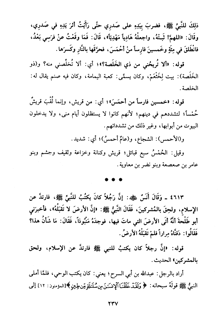 4613 - وَقَالَ أَنَسٌ - رضي الله عنه -: إنَّ رَجُلاً كانَ يكتُبُ للنَّبيِّ - صلى الله عليه وسلم -، فارتدَّ عن الإِسلامِ، ولحِقَ بالمُشركينَ، فَقَالَ النَّبيُّ - صلى الله عليه وسلم -: "إنَّ الأرضَ لا تَقبَلُهُ"، فأخبرَنيِ أبو طَلْحةَ أنَّهُ أتَى الأرضَ التي ماتَ فيها، فوجدَهُ مَنْبُوذًا، فَقَالَ: مَا شَأنُ هذا؟ فَقَالُوا: دَفنَّاهُ مِرارًا فلمْ تَقبَلْهُ الأرضُ.