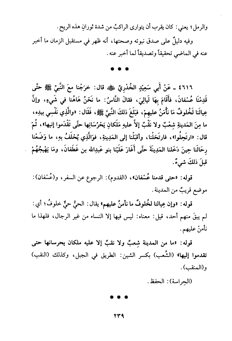 4616 - عَنْ أَبي سَعِيْدٍ الخُدْرِيِّ - رضي الله عنه - قال: خرَجْنا معَ النَّبيِّ - صلى الله عليه وسلم - حتَّى قَدِمْنَا عُسْفانَ، فأَقَامَ بِهَا لَيالِيَ، فقالَ النَّاسُ: ما نَحْنُ هَا هُنا في شَيءٍ، وإنَّ عِيالَنا لَخُلوفٌ مَا نَأْمَنُ عليهِمْ، فبَلَغَ ذلكَ النَّبيَّ - صلى الله عليه وسلم -، فَقَال: "والَّذِي نَفْسي بيدِه، ما مِنَ المَدينةِ شِعْبٌ ولا نَقْبٌ إلاَّ عليهِ مَلَكانِ يَحْرُسَانِها حتَّى تَقْدَموا إليها"، ثُمّ قال: "ارتَحِلُوا"، فارتَحَلْنا، وأقبَلْنا إلى المَدِينةِ، فوَالَّذِي يُحْلَفُ بهِ، ما وَضَعْنا رِحَالَنا حِينَ دَخَلنا المَدِينَةَ حتَّى أَغَارَ عَلَيْنا بنو عَبدِ الله بن غَطَفانَ، ومَا يَهْيجُهُمْ قبلَ ذلكَ شيءٌ.