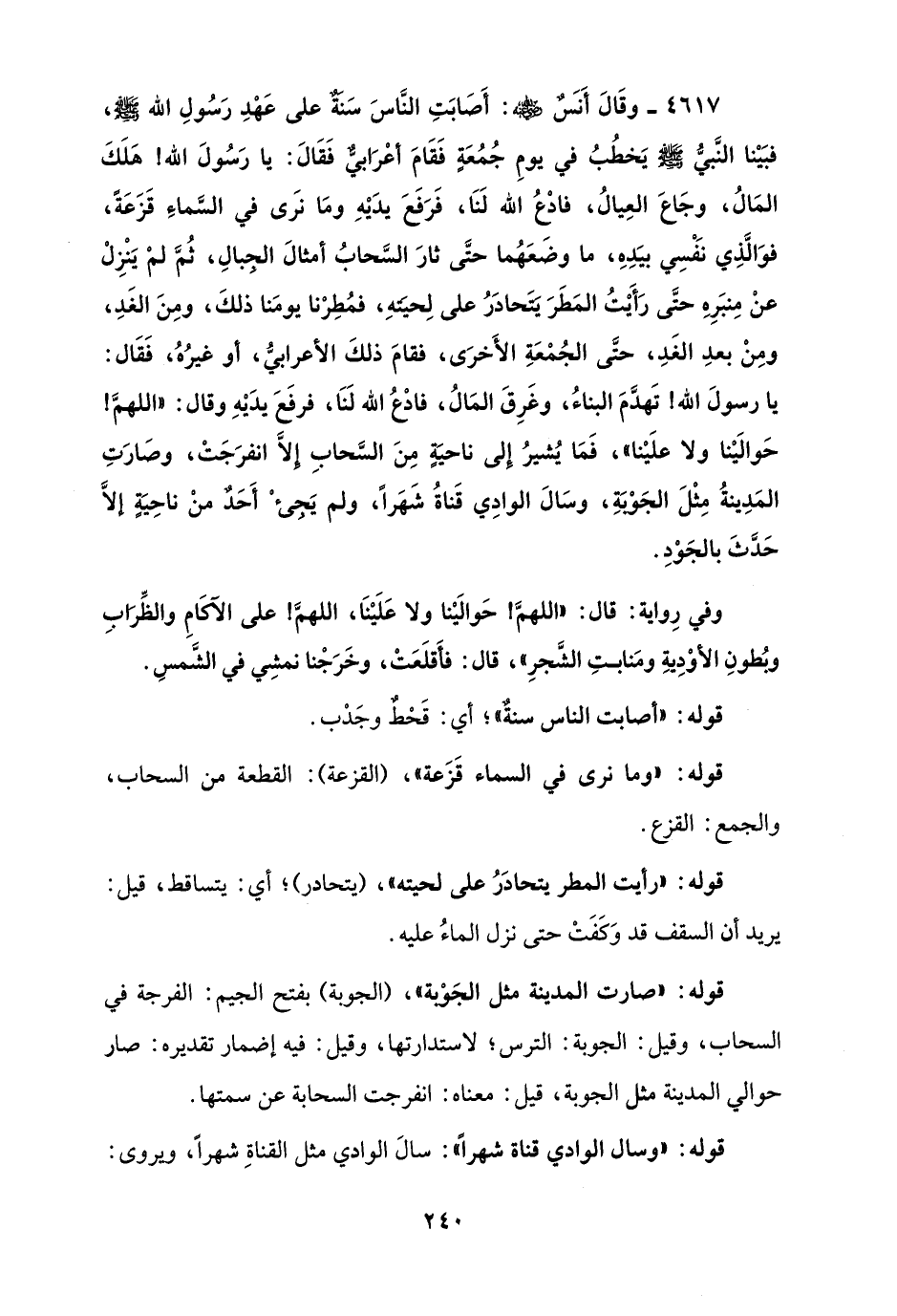 4617 - وقَالَ أَنَسٌ - رضي الله عنه -: أَصَابَتِ النَّاسَ سَنَةٌ على عَهْدِ رَسُولِ الله - صلى الله عليه وسلم -، فبَيْنا النَّبيُّ - صلى الله عليه وسلم - يَخطُبُ في يومِ جُمُعَةٍ فَقَامِ أعْرَابيٌّ فَقَالَ: يا رَسُولَ الله! هَلَكَ المَالُ، وجَاعَ العِيالُ، فادْعُ الله لَنَا، فَرَفعَ يدَيْهِ ومَا نرَى في السَّماءِ قَزَعَةً، فوَالَّذِي نفسِي بيَدِهِ، ما وضَعَهُما حتَّى ثارَ السَّحابُ أمثالَ الجِبالِ، ثُمَّ لمْ يَنْزِلْ عنْ مِنبَرِهِ حتَّى رَأَيْتُ المَطَرَ يَتَحادَرُ على لِحيَتهِ، فمُطِرْنا يومَنا ذلكَ، ومِنَ الغَدِ، ومِنْ بعدِ الغَدِ، حتَّى الجُمْعَةِ الأَخرَى، فقامَ ذلكَ الأعرابيُّ، أو غيرُهُ، فَقَال: يا رسولَ الله! تَهدَّمَ البناءُ, وغَرِقَ المَالُ، فادْع الله لَنَا، فرفَعَ يدَيْهِ وقال: "اللهمَّ! حَوالَيْنا ولا علَيْنا"، فَمَا يُشيرُ إلى ناحيَةٍ مِنَ السَّحابِ إِلاَّ انفرَجَتْ، وصَارَتِ المَدِينةُ مِثْلَ الجَوْبَةِ، وسَالَ الوادِي قَناةُ شَهَرًا، ولم يَجِئْ أَحَدٌ منْ ناحِيَةٍ إلاَّ حَدَّثَ بالجَوْدِ.