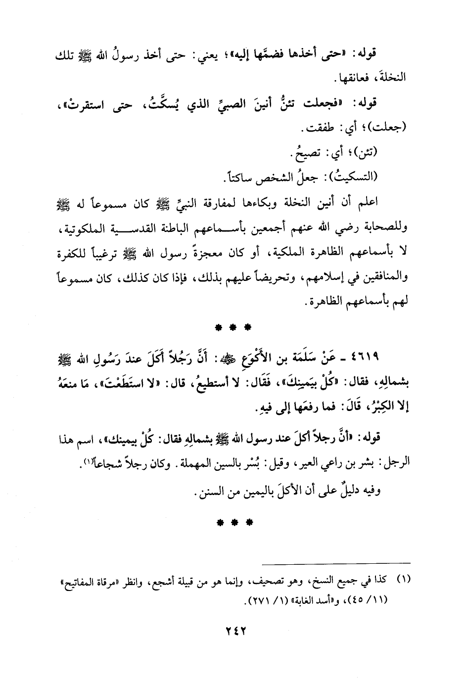 4619 - عَنْ سَلَمَة بن الأَكْوَعِ - رضي الله عنه -: أَنَّ رَجُلاً أَكَلَ عندَ رَسُولِ الله - صلى الله عليه وسلم - بشمالِهِ، فقال: "كُلْ بيَميِنِكَ"، فَقَال: لا أستطيعُ، قال: "لا استَطَعْتَ"، مَا منعَهُ إلا الكِبْرُ، قَالَ: فما رفعَها إلى فيهِ.