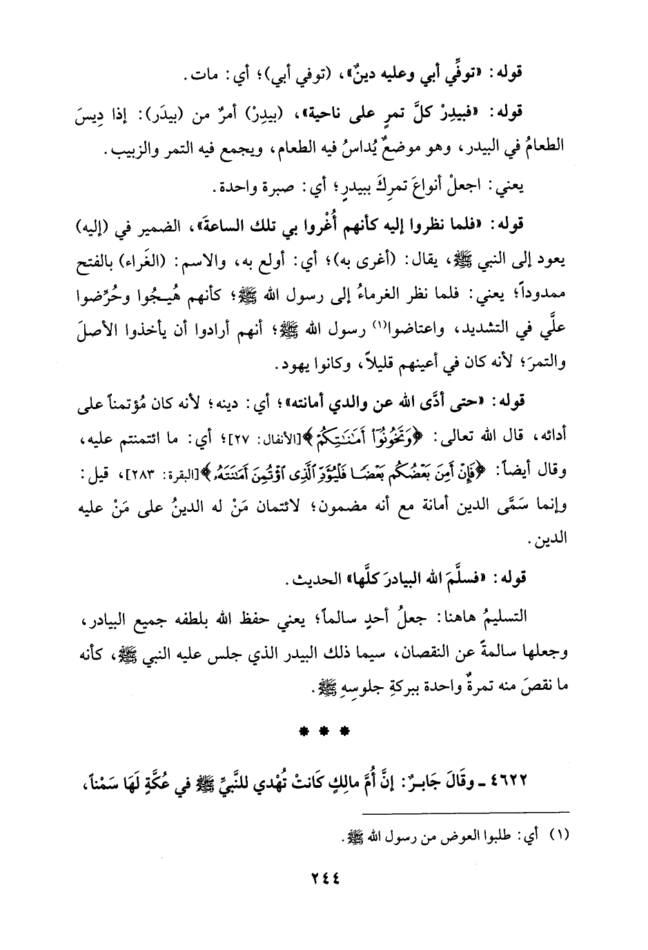 قوله: "فلما نظروا إليه كأنهم أُغْروا بي تلك الساعةَ"، الضمير في (إليه) يعود إلى النبي - صلى الله عليه وسلم -، يقال: (أغرى به)؛ أي: أولع به، والاسم: (الغَراء) بالفتح ممدودًا؛ يعني: فلما نظر الغرماءُ إلى رسول الله - صلى الله عليه وسلم -؛ كأنهم هُيجُوا وحُرِّضوا علَّي في التشديد، واعتاضوا (¬1) رسول الله - صلى الله عليه وسلم -؛ أنهم أرادوا أن يأخذوا الأصلَ والتمرَ؛ لأنه كان في أعينهم قليلاً، وكانوا يهود.