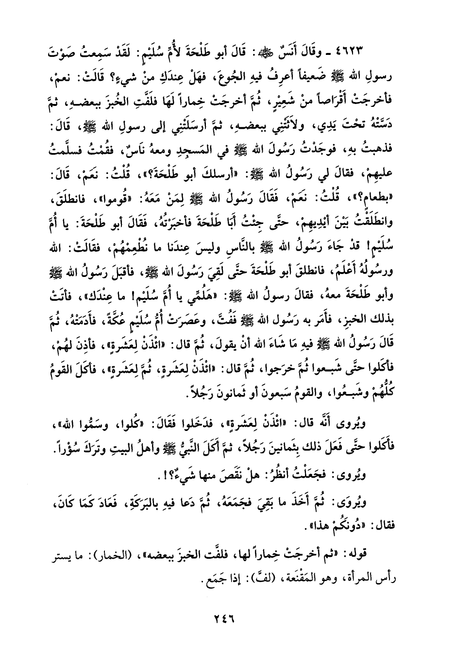 4623 - وقَالَ أَنَسٌ - رضي الله عنه -: قَالَ أبو طَلْحَةَ لأُمِّ سُلَيْمٍ: لَقَد سَمِعتُ صَوْتَ رسولِ الله - صلى الله عليه وسلم - ضَعيفًا أعرِفُ فيهِ الجُوعَ، فهلْ عِندَكِ منْ شيءٍ؟ قَالَتْ: نعمْ، فأخرجَتْ أَقْرَاصًا منْ شَعِيْرٍ، ثُمَّ أخرجَتْ خِمارًا لَها فلَفَّتِ الخُبزَ ببعضهِ، ثمَّ دَسَّتْهُ تحْتَ يَدِي، ولاَثَتْنِي ببعضهِ، ثمَّ أرسَلَتْنِي إلى رسولِ الله - صلى الله عليه وسلم -، قَالَ: فذهبتُ بهِ، فوجَدْتُ رَسُولَ الله - صلى الله عليه وسلم - في المَسجِدِ ومعهُ نَاسٌ، فقُمتُ فسلَّمتُ عليهِمْ، فقالَ في رَسُولُ الله - صلى الله عليه وسلم -: "أرسلكَ أبو طَلْحَةَ؟ "، قُلْتُ: نَعَمْ، قَالَ: "بطعامٍ؟ "، قُلْتُ: نَعَمْ، فَقَالَ رَسُولُ الله - صلى الله عليه وسلم - لِمَنْ مَعَهُ: "قُوموا"، فانطلَقَ، وانطَلَقْتُ بَيْنَ أيْدِيهِمْ، حتَّى جِئْتُ أَبَا طَلْحَةَ فأخبَرْتُهُ، فَقَالَ أبو طَلْحَةَ: يا أُمَّ سُلَيْمٍ! قد جَاءَ رَسُولُ الله - صلى الله عليه وسلم - بالنَّاسِ وليسَ عِندَنا ما نُطْعِمْهُم، فقَالَتْ: الله ورسُولُهُ أَعْلَمُ، فانطلقَ أبو طَلْحَةَ حتَّى لَقِيَ رَسُولَ الله - صلى الله عليه وسلم -، فأقبَلَ رَسُولُ الله - صلى الله عليه وسلم - وأبو طَلْحَةَ معهُ، فقالَ رسولُ الله - صلى الله عليه وسلم -: "هَلُمَّي يا أُمَّ سُلَيْم! ما عِنْدَك"، فأتَتْ بذلك الخبزِ، فأَمَر به رَسُول الله - صلى الله عليه وسلم - فَفُتَّ، وعَصَرَتْ أُمُّ سُلَيْمٍ عُكَّةً، فأَدَمَتْهُ، ثُمَّ قَالَ رَسُولُ الله - صلى الله عليه وسلم - فيهِ مَا شَاءَ الله أنْ يقولَ، ثُمَّ قال: "ائْذَنْ لِعَشَرةٍ"، فأذِنَ لهُمْ، فأكَلوا حتَّى شَبعوا ثُمَ خرَجوا، ثُمَّ قال: "ائْذَنْ لِعَشَرةٍ، ثُمَّ لِعَشَرةٍ"، فأكَلَ القَومُ كُلُّهم وشَبعُوا، والقومُ سَبعونَ أو ثَمانونَ رَجُلاً.