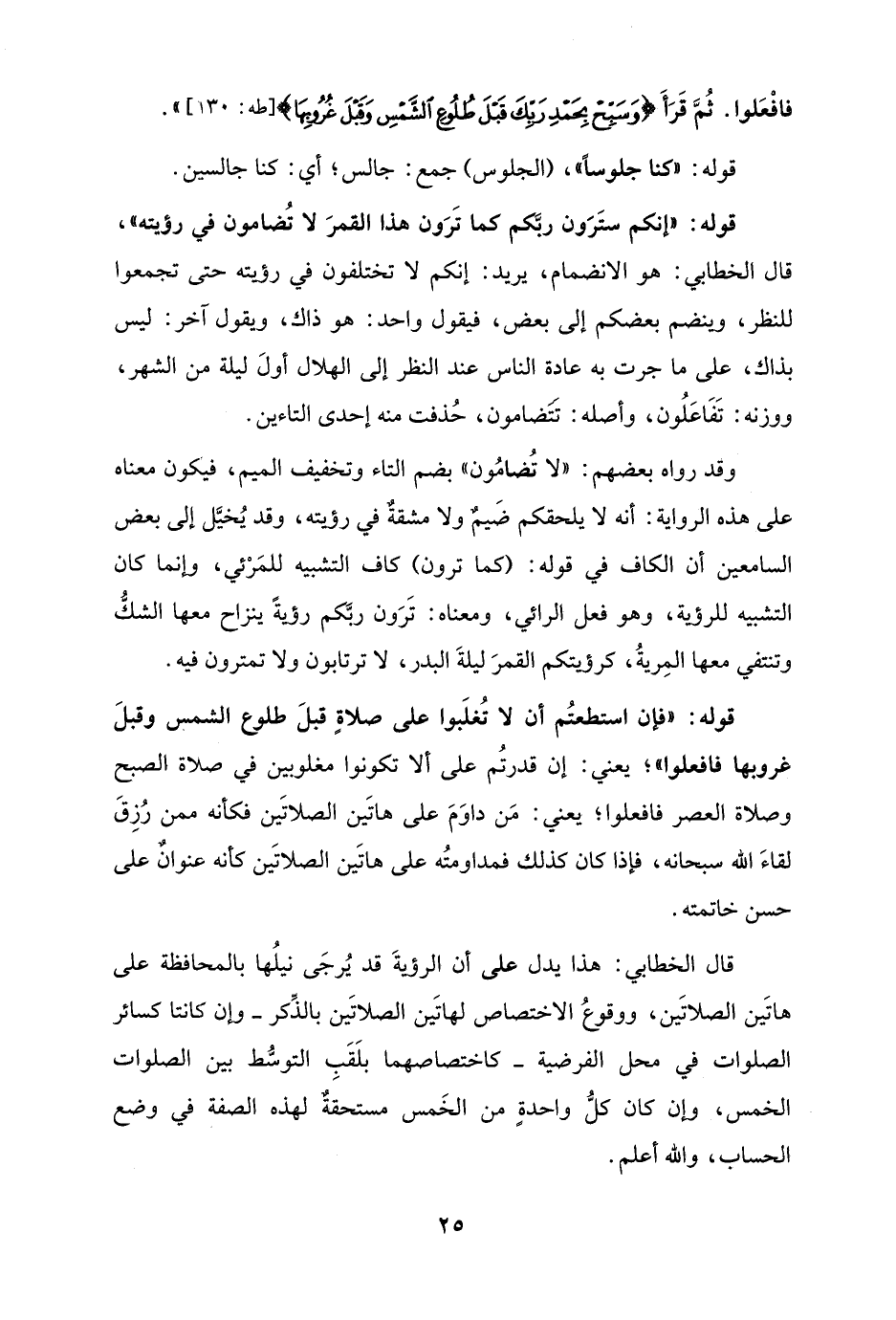 قوله: "إنكم ستَرَون ربَّكم كما تَرَون هذا القمرَ لا تُضامون في رؤيته"، قال الخطابي: هو الانضمام، يريد: إنكم لا تختلفون في رؤيته حتى تجمعوا للنظر، وينضم بعضكم إلى بعض، فيقول واحد: هو ذاك، ويقول آخر: ليس بذاك، على ما جرت به عادة الناس عند النظر إلى الهلال أولَ ليلة من الشهر، ووزنه: تَفَاعَلُون، وأصله: تَتَضامون، حُذفت منه إحدى التاءين.