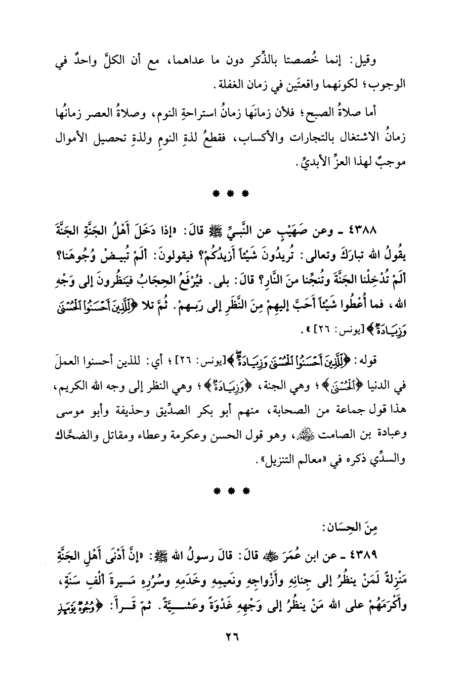 قوله: {لِلَّذِينَ أَحْسَنُوا الْحُسْنَى وَزِيَادَةٌ} [يونس: 26]؛ أي: للذين أحسنوا العملَ في الدنيا {الْحُسْنَى}، وهي الجنة، {وَزِيَادَةٌ} وهي النظر إلى وجه الله الكريم، هذا قول جماعة من الصحابة، منهم أبو بكر الصدِّيق وحذيفة وأبو موسى وعبادة بن الصامت - رضي الله عنهم -، وهو قول الحسن وعكرمة وعطاء ومقاتل والضحَّاك والسدِّي ذكره في "معالم التنزيل".