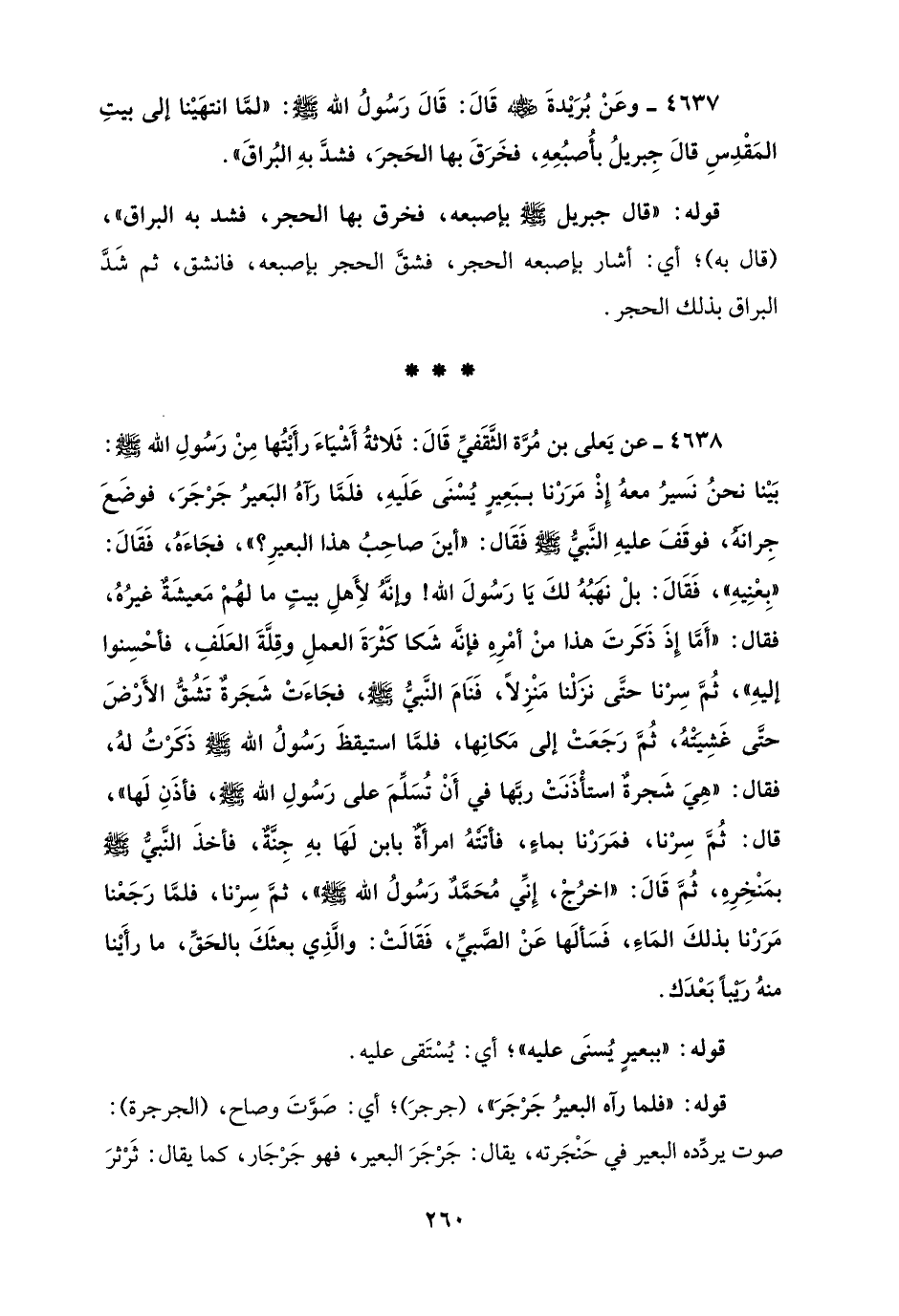 4637 - وعَنْ بُرَيْدةَ - رضي الله عنه - قَالَ: قَالَ رَسُولُ الله - صلى الله عليه وسلم -: "لمَّا انتهَيْنا إلى بيتِ المَقْدِسِ قالَ جِبريلُ بأُصبُعِهِ، فخَرَقَ بها الحَجرَ، فشدَّ بهِ البُراقَ".