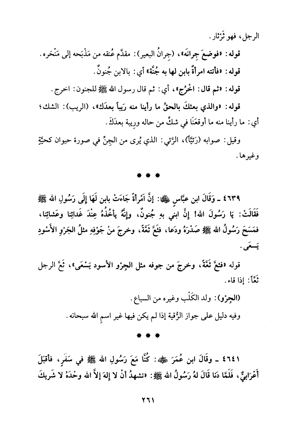 4639 - وَقَالَ ابن عبَّاسٍ - رضي الله عنهما -: إنَّ اَمْرأةً جَاءَتْ بابن لَها إلَى رَسُولِ الله - صلى الله عليه وسلم - فَقَالَتْ: يَا رَسُولَ الله! إِنَّ ابني بهِ جُنونٌ، وإِنَّهُ يأخُذُهُ عِنْدَ غَدائِنا وعَشائِنا، فمَسَحَ رَسُولُ الله - صلى الله عليه وسلم - صَدرَهُ ودَعا، فثَعَّ ثَعَّةً، وخرجَ منْ جَوْفِهِ مثلُ الجَروِ الأَسْودِ يَسعَى.