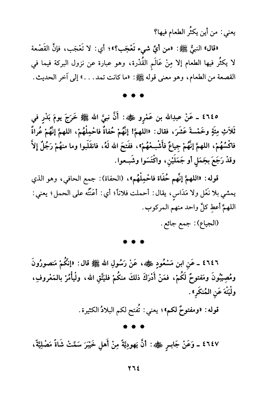 4645 - عَنْ عبدِ الله بن عَمرٍو - رضي الله عنه -: أَنَّ نبيَّ الله - صلى الله عليه وسلم - خَرَجَ يومَ بَدرٍ في ثَلاَثِ مِئةٍ وخَمْسةَ عَشَرَ، فقال: "اللهمَّ! إنَّهُمْ حُفاةٌ فاحمِلْهُمْ، اللهمَّ إنَّهُمْ عُراةٌ فاكْسُهُمْ، اللهمَّ إنَّهُمْ جِياعٌ فأَشْبعْهُمْ"، ففَتحَ الله لَهُ، فانقَلَبوا وما منهُمْ رَجُلٌ إلَّا وقد رَجَعَ بجَمَلٍ أو جَمَلَيْنِ، واكْتَسَوا وشَبعوا.