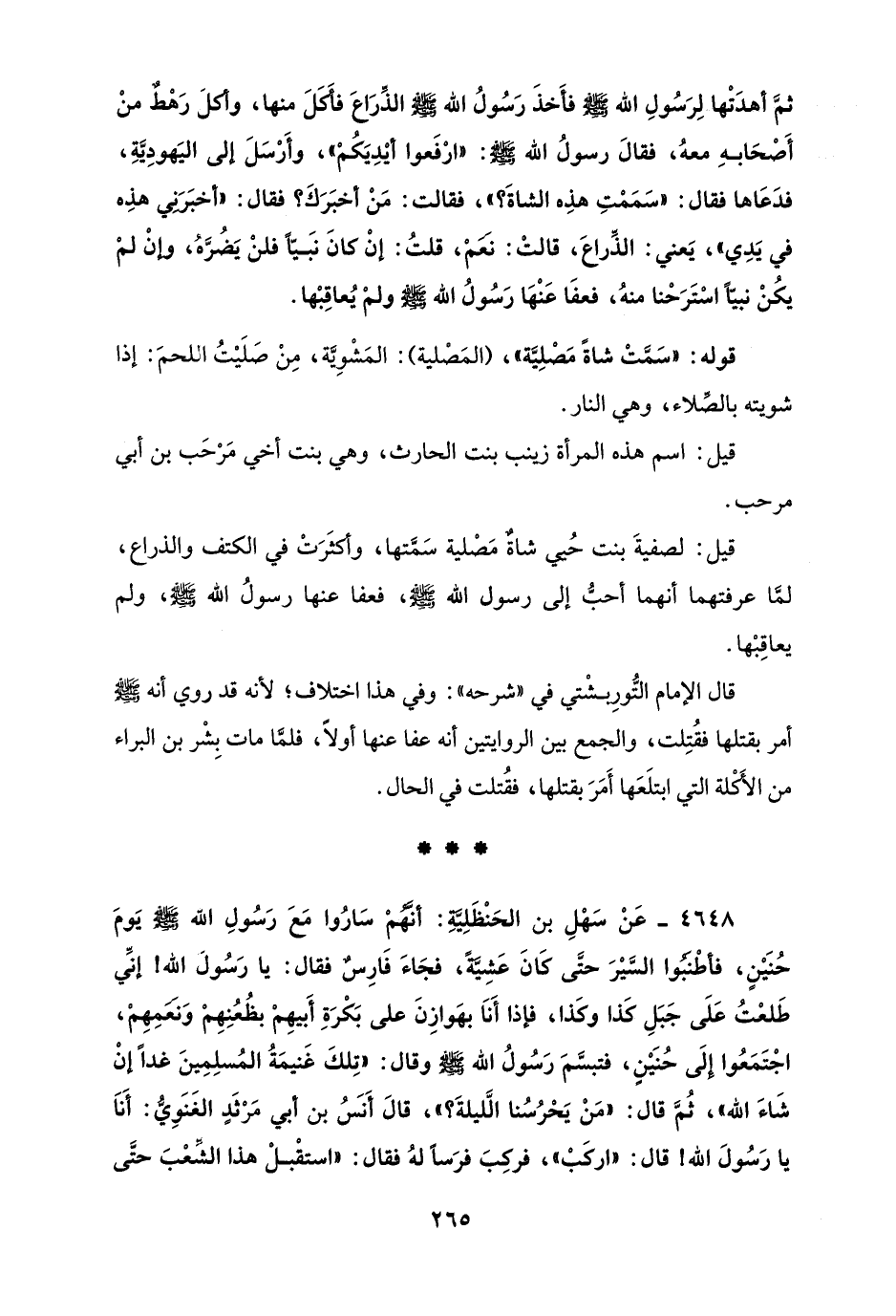 ثمَّ أهدَتْها لِرَسُولِ الله - صلى الله عليه وسلم - فأَخذَ رَسُولُ الله - صلى الله عليه وسلم - الذِّرَاعَ فأَكَلَ منها، وأكلَ رَهْطٌ منْ أَصحَابهِ معهُ، فقالَ رسولُ الله - صلى الله عليه وسلم -: "ارْفَعوا أيْدِيَكُمْ"، وأَرْسَلَ إلى اليَهودِيَّةِ، فدَعَاها فقال: "سَمَمْتِ هذِه الشاةَ؟ "، فقالت: مَنْ أخبَرَكَ؟ فقال: "أخبَرَنِي هذِه في يَدِي"، يَعني: الذَّراعَ، قالتْ: نَعَمْ، قلتُ: إنْ كانَ نَبيًّا فلنْ يَضُرَّهُ، وإنْ لمْ يكُنْ نبيًّا اسْتَرَحْنا منهُ، فعفَا عَنْهَا رَسُولُ الله - صلى الله عليه وسلم - ولم يُعاقِبْها.