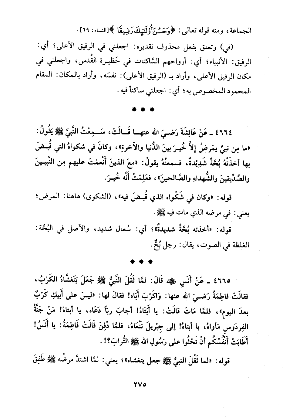 4664 - عَنْ عَائِشَةَ رَضيَ الله عنها قَالَتْ، سَمِعْتُ النَّبيَّ - صلى الله عليه وسلم - يَقُولُ: "ما مِن نبيِّ يمَرضُ إِلاَّ خُيرَ بينَ الدُّنيا والآخرةِ"، وكانَ في شكواهُ التي قُبضَ بها أخذَتْهُ بُحَّةٌ شَدِيْدةٌ، فسمعتُهُ يقولُ: "معَ الذينَ أَنْعمْتَ عليهم مِن النَّبيينَ والصِّدِّيقينَ والشُّهداء والصَّالحينَ"، فعَلِمتُ أَنَّه خُيرَ.