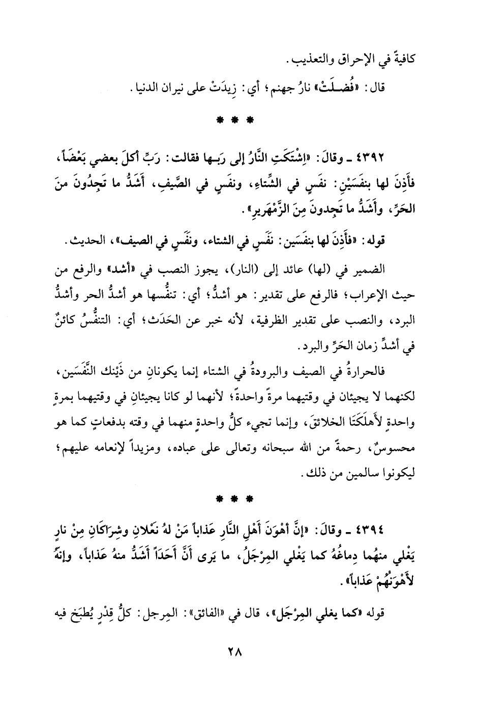 4392 - وقالَ: "اِشْتَكَتِ النَّارُ إلى رَبها فقالت: رَبِّ أَكلَ بعضي بَعْضًا، فأَذِنَ لها بنفَسَيْنِ: نفَسٍ في الشِّتاءِ، ونفَسٍ في الصَّيفِ، أَشَدُّ ما تَجِدُونَ منَ الحَرِّ، وأَشَدُّ ما تَجِدونَ مِنَ الزَّمْهَريرِ".