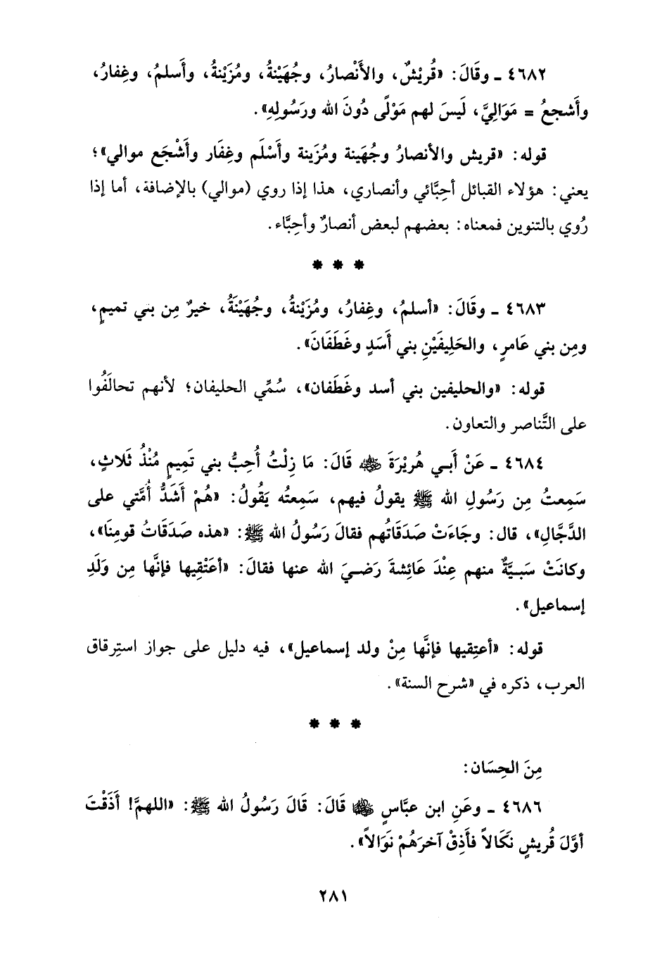 4684 - عَنْ أَبي هُريْرَة - رضي الله عنه - قَالَ: مَا زِلْتُ أُحِبُّ بني تَمِيمٍ مُنذُ ثَلاثٍ، سَمِعتُ مِن رَسُولِ الله - صلى الله عليه وسلم - يقولُ فيهم، سَمِعتُه يَقُولُ: "هُمْ أَشَدُّ أُمَّتي على الدَّجَّالِ"، قال: وجَاءَتْ صَدَقَاتُهم فقالَ رَسُولُ الله - صلى الله عليه وسلم -: "هذه صَدَقَاتُ قومِنَا"، وكانَتْ سَبيَّةٌ منهم عِنْدَ عَائِشةَ رَضيَ الله عنها فقالَ: "أعَتْقِيها فإنَّها مِن وَلَدِ إسماعيل".