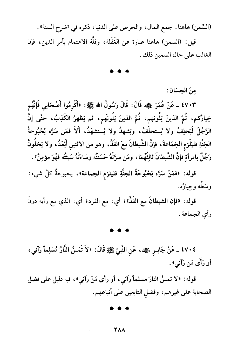 4703 - عَنْ عُمَرَ - رضي الله عنه - قَالَ: قَالَ رَسُولُ الله - صلى الله عليه وسلم -: "أَكْرِمُوا أَصحَابي فَإنَّهُم خِيارُكم، ثُمَّ الذينَ يَلُونهم، ثُمَّ الذينَ يَلُونَهم، ثم يَظهرُ الكَذِبُ، حتَّى إنَّ الرَّجُلَ لَيَحلِفُ ولا يُستحلَفُ، ويَشهدُ ولا يُستشهدُ، أَلاَ فمَن سَرَّه بُحْبُوحةُ الجَنَّةِ فليَلْزمِ الجَمَاعةَ، فإنَّ الشَّيطانَ معَ الفَذِّ، وهو من الاثنينِ أَبْعَدُ، ولا يَخلُونَّ رَجُلٌ بامرأةٍ فإنَّ الشَّيطانَ ثالِثُهُمَا، ومَن سرَّتْهُ حَسَنَتُه وسَاءَتْهُ سَيئَتُه فهُوَ مؤمِنٌ".
