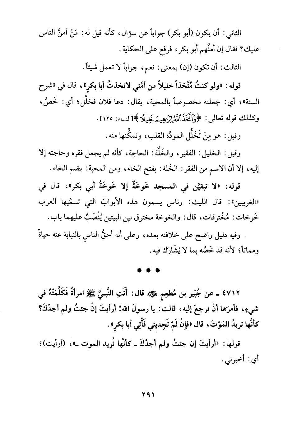 4712 - عن جُبَير بن مُطعِمٍ - رضي الله عنه - قال: أَتَتِ النَّبيَّ - صلى الله عليه وسلم - امرأةٌ فَكَلَّمَتْهُ في شيءٍ، فأمرَها أنْ ترجعَ إليه، قالت: يا رسولَ الله! أرأيتَ إنْ جئتُ ولم أجدْكَ؟ كأنَّها تريدُ المَوْتَ، قال "فإنْ لَمْ تَجِديني فَأْتِي أبا بكرٍ".