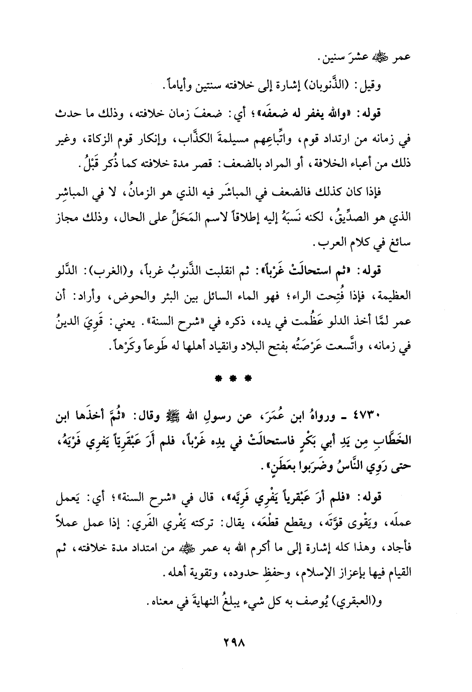 4730 - ورواهُ ابن عُمَرَ، عن رسولِ الله - صلى الله عليه وسلم - وقال: "ثُمَّ أخذَها ابن الخَطَّابِ مِن يَدِ أبي بَكْرٍ فاستحالَتْ في يدِه غرْبًا، فلم أَرَ عَبْقَرِيًّا يَفرِي فَرْيَهُ، حتى رَوِي النَّاسُ وضَرَبوا بعَطَنٍ".