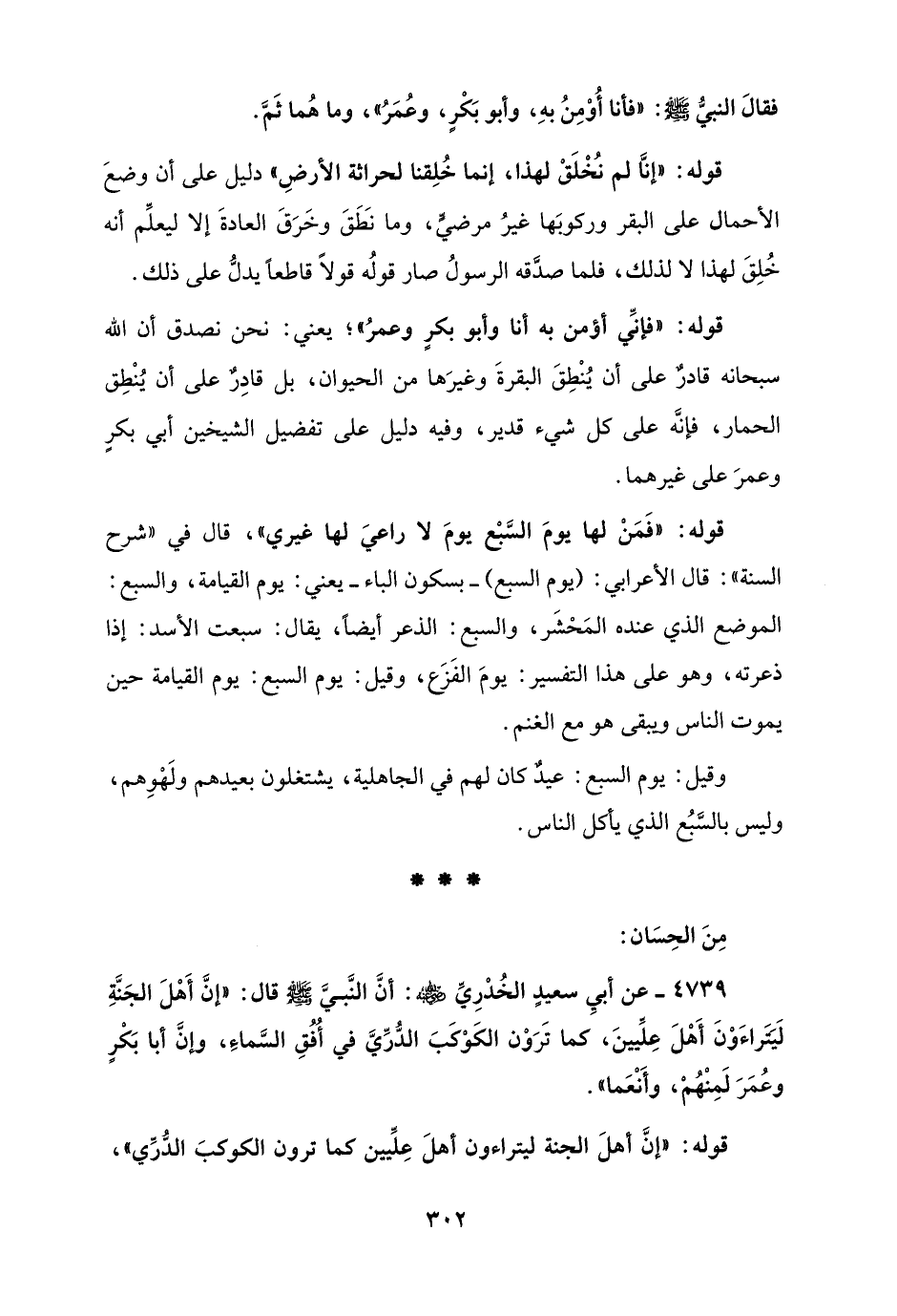 4739 - عن أبيِ سعيدٍ الخُدْرِيِّ - رضي الله عنه -: أنَّ النَّبيَّ - صلى الله عليه وسلم - قال: "إنَّ أَهْلَ الجَنَّةِ لَيَتَراءَوْنَ أَهْلَ عِلِّيينَ، كما تَرَوْن الكَوْكَبَ الدُّرِّيَّ في أُفُقِ السَّماءِ، وإنَّ أبا بَكْرٍ وعُمَرَ لَمِنْهُمْ، وأَنْعَما".
