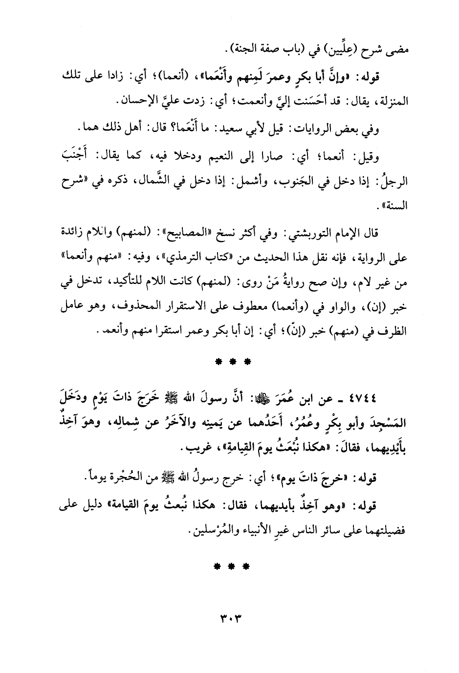 قال الإمام التوربشتي: وفي أكثر نسخ "المصابيح": (لمنهم) واللام زائدة على الرواية، فإنه نقل هذا الحديث من "كتاب الترمذي"، وفيه: "منهم وأنعما" من غير لام، وإن صح روايةُ مَنْ روى: (لمنهم) كانت اللام للتأكيد، تدخل في خبر (إن)، والواو في (وأنعما) معطوف على الاستقرار المحذوف، وهو عامل الظرف في (منهم) خبر (إنّ)؛ أي: إن أبا بكر وعمر استقرا منهم وأنعما.