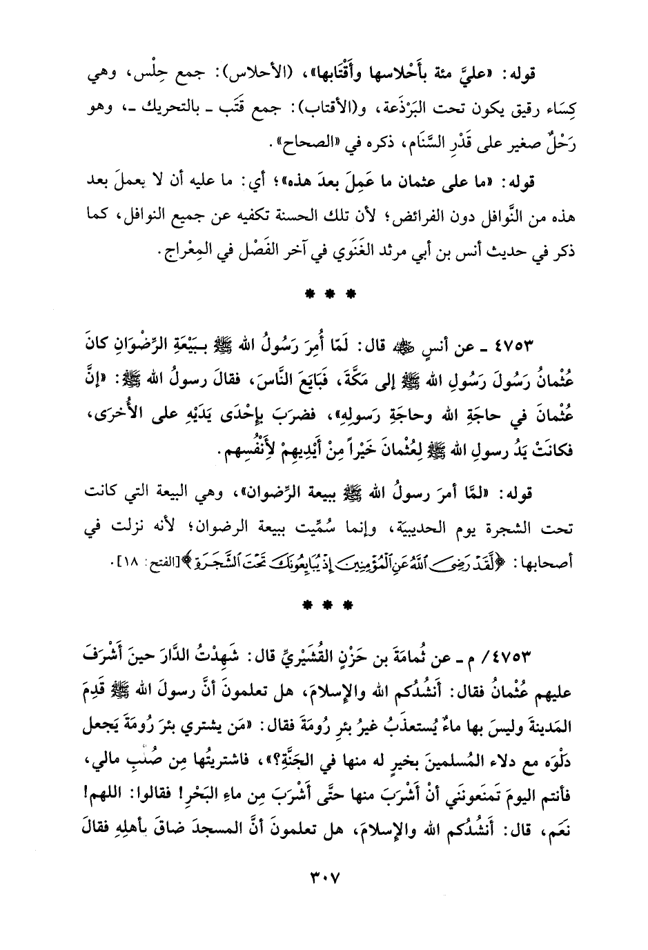 4753/ م - عن ثُمامَةَ بن حَزْنٍ القُشَيْريِّ قال: شَهِدْتُ الدَّارَ حينَ أَشْرَفَ عليهم عُثْمانُ فقال: أَنشُدُكم الله والإِسَلامَ، هل تعلمونَ أنَّ رسولَ الله - صلى الله عليه وسلم - قَدِمَ المَدينةَ وليسَ بها ماءٌ يُستعذَبُ غيرُ بئرِ رُومَةَ فقال: "مَن يشتري بئرَ رُومَةَ يَجعل دَلْوَه مع دلاء المُسلمينَ بخيرٍ له منها في الجَنَّةِ؟ "، فاشتريتُها مِن صُلْبِ مالي، فأنتم اليومَ تَمنَعونَني أنْ أَشْرَبَ منها حتَّى أَشْرَبَ مِن ماءِ البَحْرِ! فقالوا: اللهم! نَعَم، قال: أَنشُدُكم الله والإِسلامَ، هل تعلمونَ أنَّ المسجدَ ضاقَ بأهلِهِ فقالَ