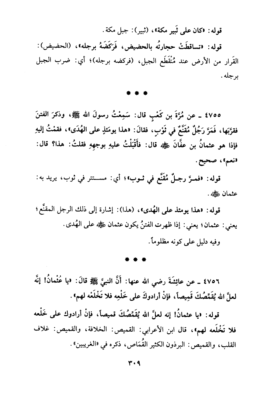 4756 - عن عائِشَةَ رضي الله عنها: أَنَّ النبيَّ - صلى الله عليه وسلم - قالَ: "يا عُثْمانُ! إنَّه لعلَّ الله يُقَمِّصُكَ قَمِيصًا، فإنْ أرادوكَ على خَلْعِه فلا تَخْلَعْه لهم".