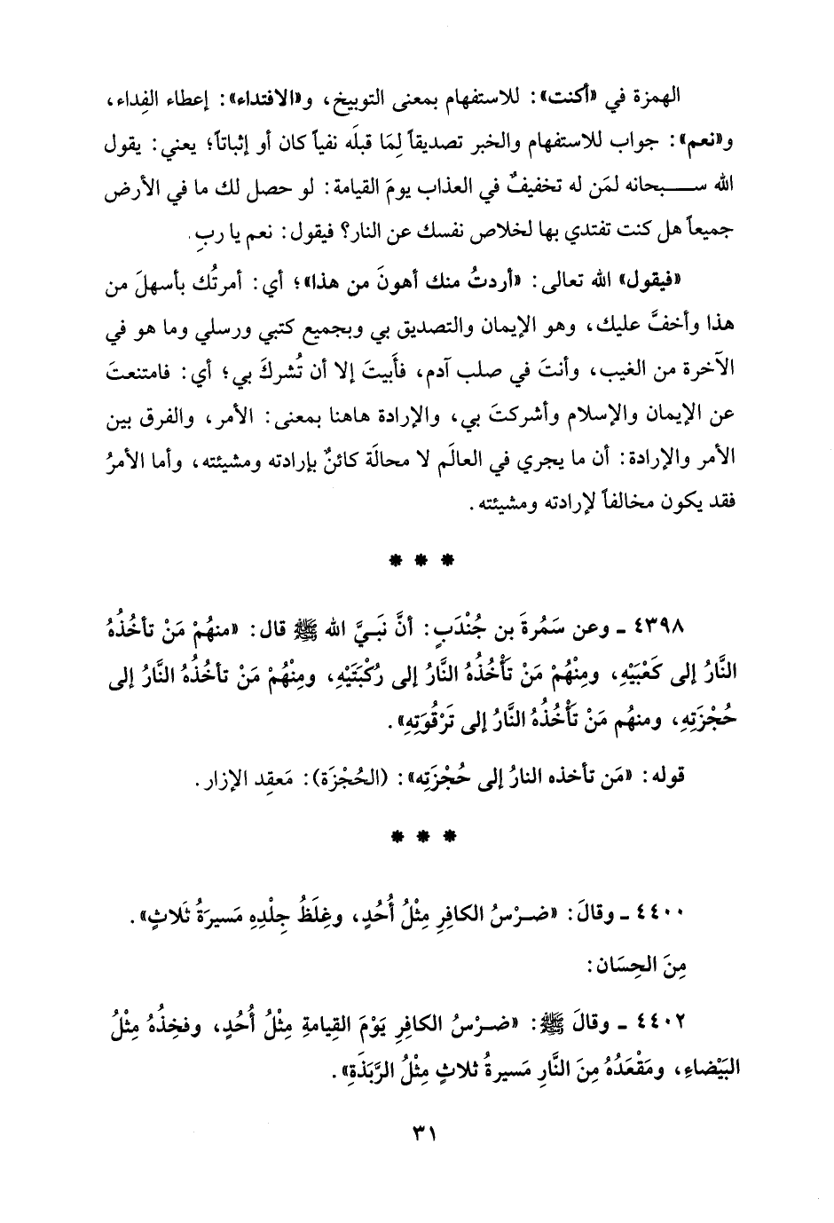 4398 - وعن سَمُرةَ بن جُنْدَبٍ: أنَّ نَبيَّ الله - صلى الله عليه وسلم - قال: "منهُمْ مَنْ تأخُذُهُ النَّارُ إلى كَعْبَيْهِ، ومِنْهُمْ مَنْ تَأْخُذُهُ النَّارُ إلى رُكبَتَيْهِ، ومِنْهُمْ مَنْ تأخُذُهُ النَّارُ إلى حُجْزَتِهِ، ومنهُم مَنْ تَأْخُذُهُ النَّارُ إلى تَرْقُوَتِهِ".
