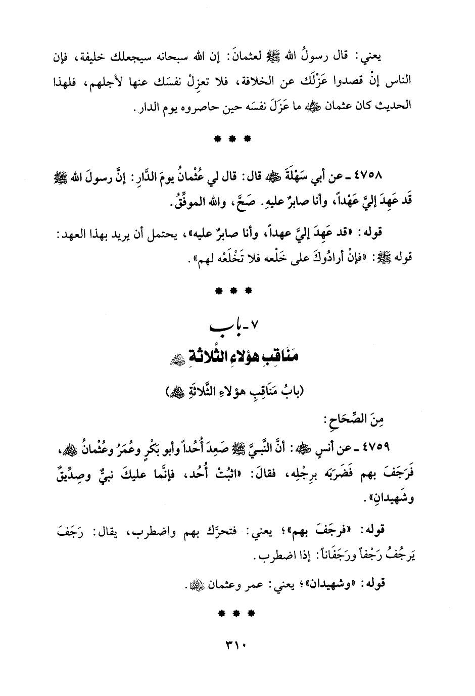 4759 - عن أنسٍ - رضي الله عنه -: أنَّ النَّبيَّ - صلى الله عليه وسلم - صَعِدَ أُحُدًا وأبو بَكْرٍ وعُمَرُ وعُثْمانُ - رضي الله عنهم -، فَرَجَفَ بهم فَضَرَبَه برِجْلِه، فقالَ: "اثبُتْ أُحُد، فإنَّما عليكَ نبيٌّ وصِدِّيقٌ وشَهيدانِ".